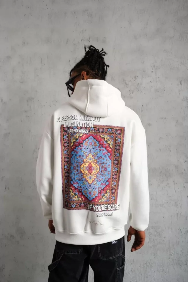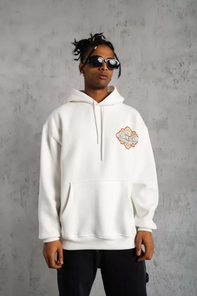 Erkek Kilim Desen Kapüşonlu Sweat- Beyaz
