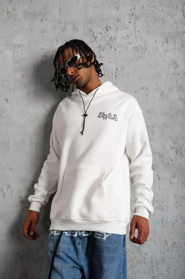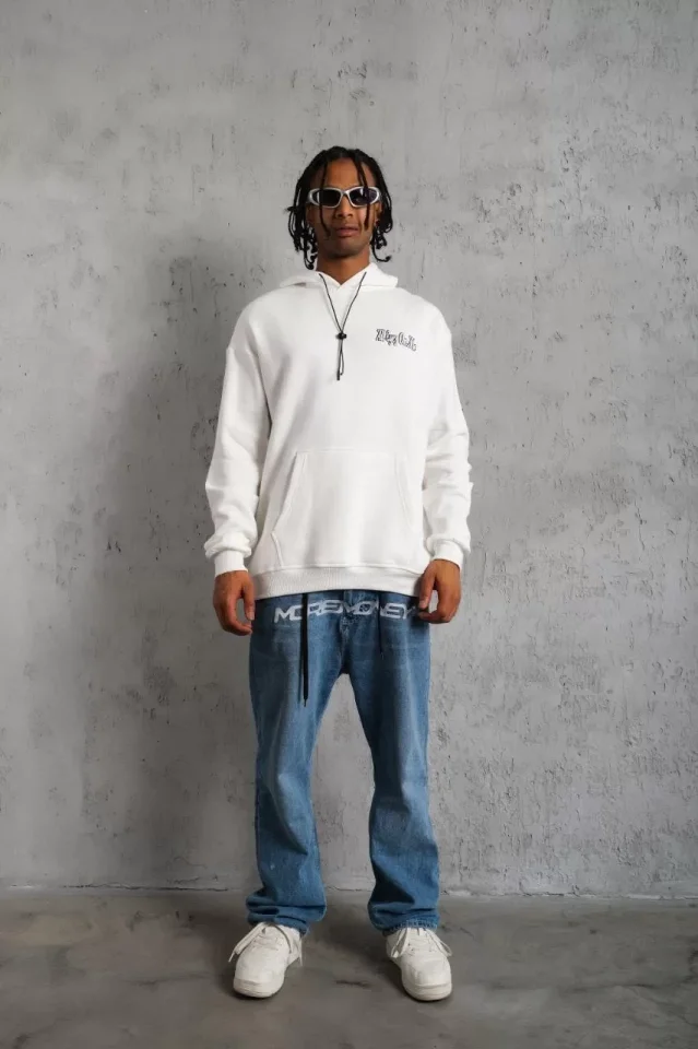 Erkek Kol Ve Etek Ribana Baskılı Kapüşonlu Sweat – Beyaz