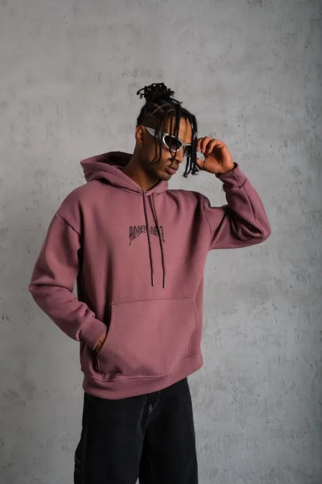 Erkek Kordon İpli Baskılı Kapüşonlu Sweatshirt – Gül Kurusu