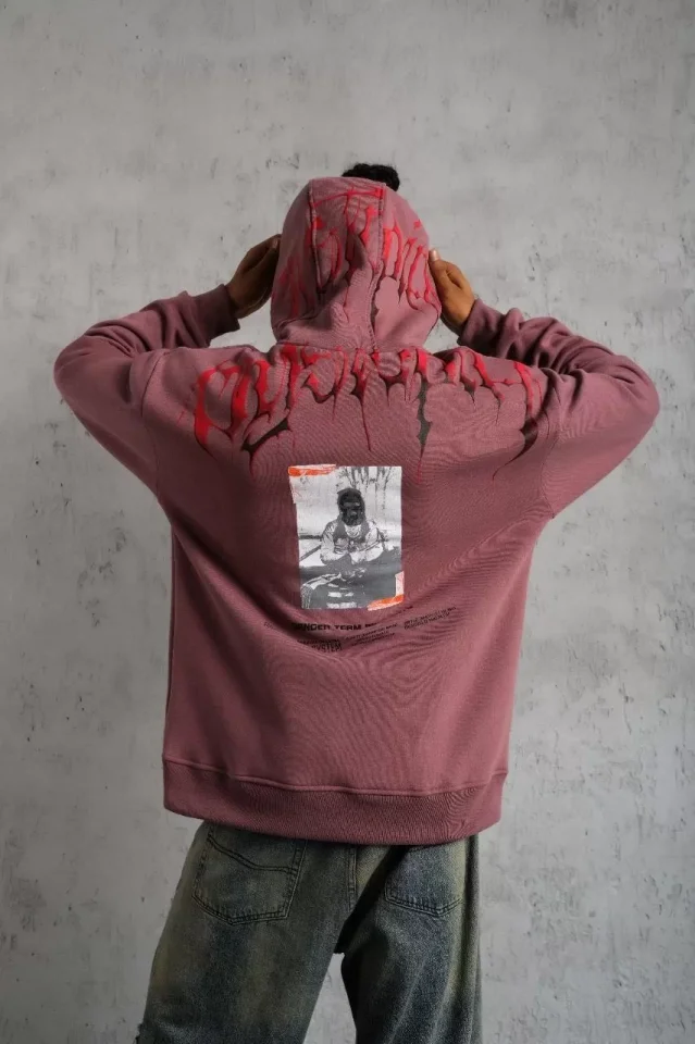 Erkek Ön Ve Arka Baskılı Kapüşonlu 3 İplik Sweatshirt – Gül Kurusu