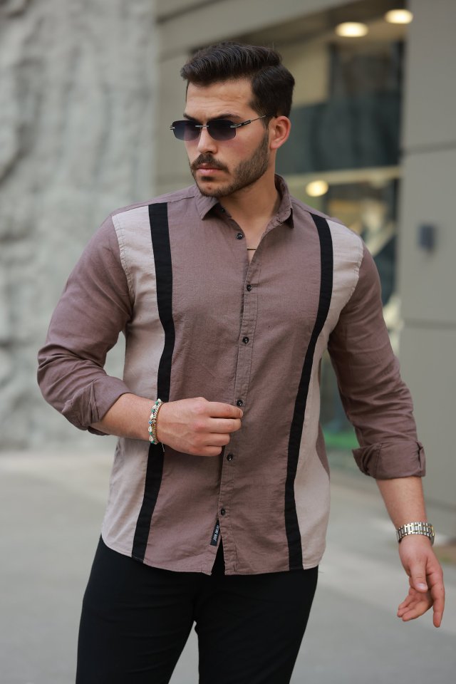 Erkek şerit Detaylı Uzun Kollu Pamuklu Keten Gömlek