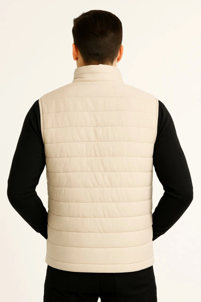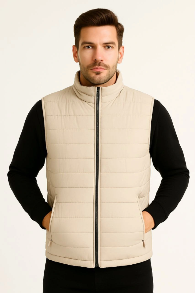 Erkek Şişme Fermuarlı Yelek Su Itici Kapitone Astarlı Kumaş Cepli Hafif Kışlık Spor Rahat Kalıp -Bej