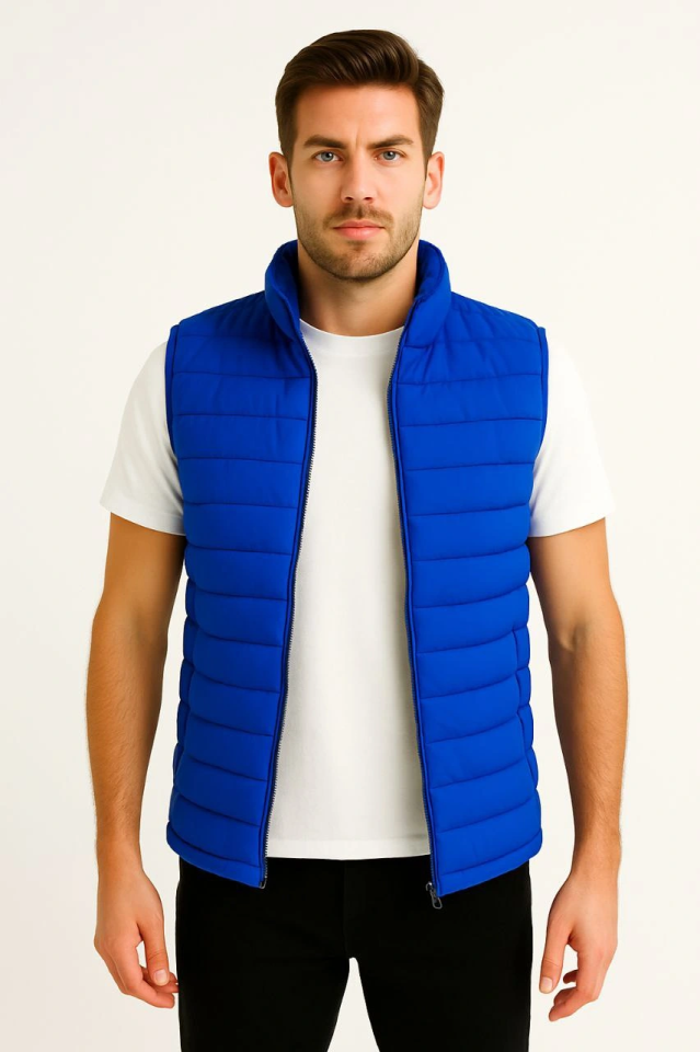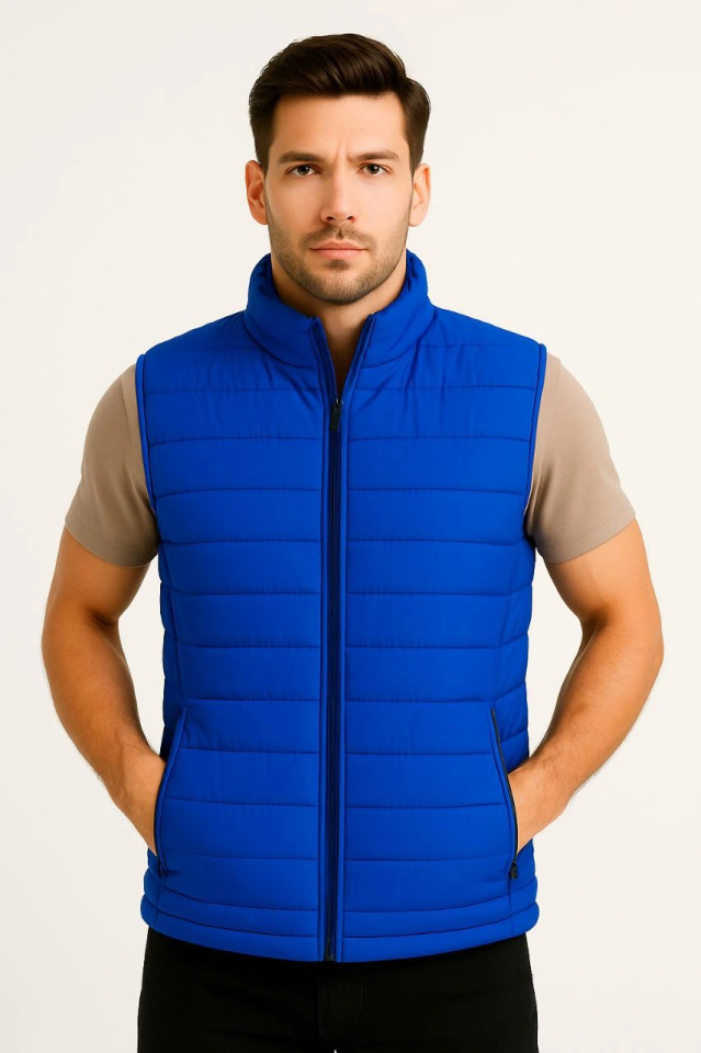 Erkek Şişme Fermuarlı Yelek Su Itici Kapitone Astarlı Kumaş Cepli Hafif Kışlık Spor Rahat Kalıp – Saks Mavisi