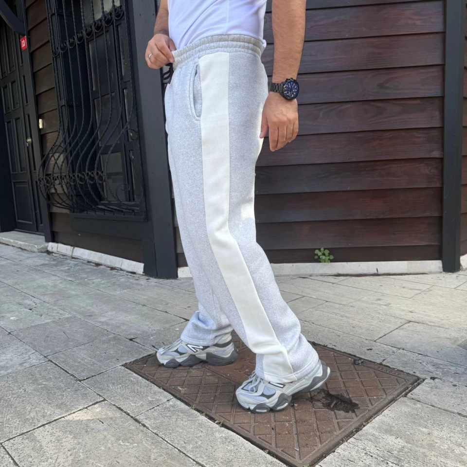 Erkek Üç İplik Kışlık Pamuklu Yandan Garneli Kalın Bej Şeritli Cepli Eşofman Altı – Gri