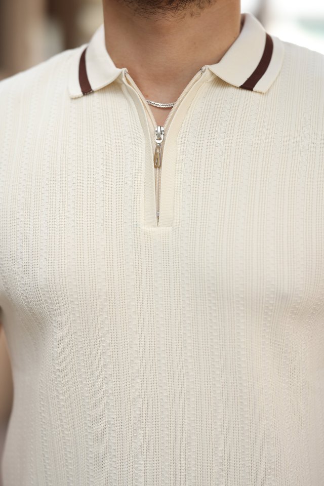 Erkek Yaka Ve Kolları çizgi Detaylı Fermuarlı Kısa Kollu T-shirt