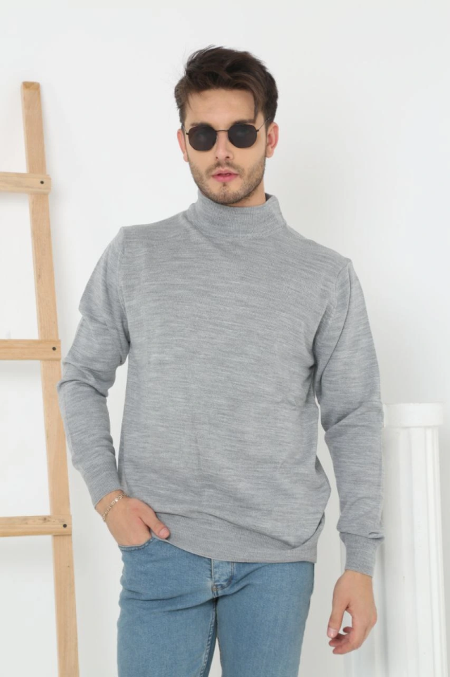 Erkek Yarım Boğaz Triko Kazak Yumuşak Dokulu Pamuklu Ince Dokuma, Uzun Kollu Rahat Regular Kalıp – Gri