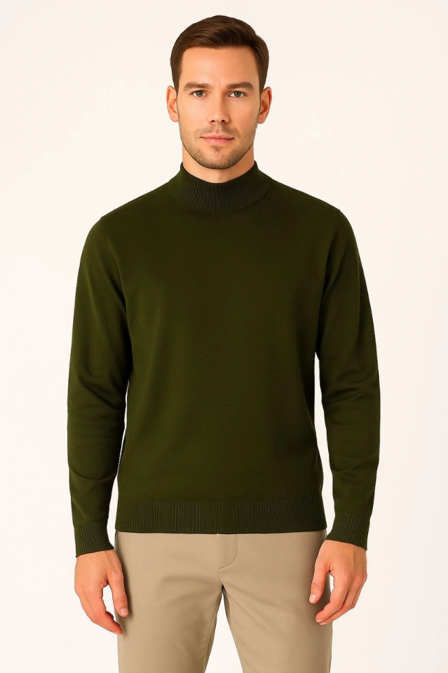 Erkek Yarım Boğaz Triko Kazak Yumuşak Dokulu Pamuklu Ince Dokuma, Uzun Kollu Rahat Regular Kalıp – Haki