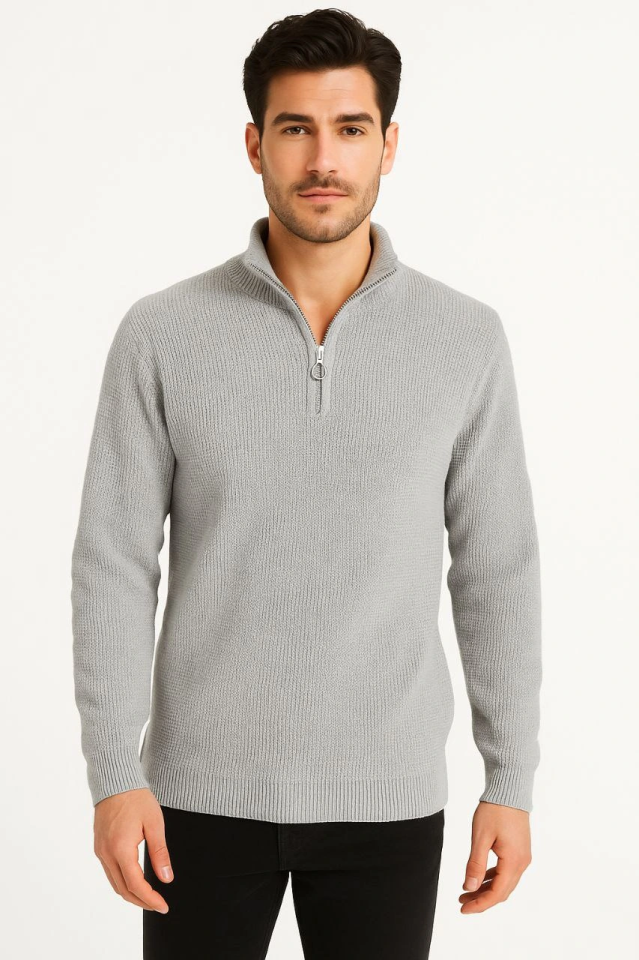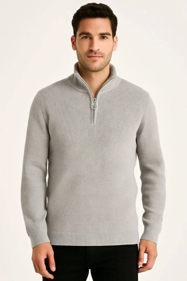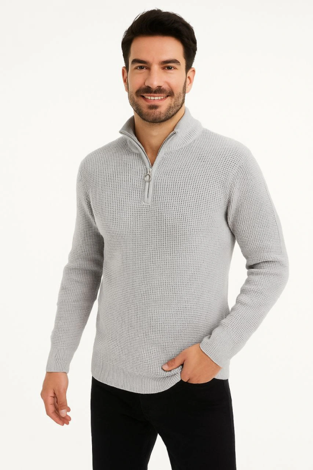 Erkek Yarım Fermuarlı Triko Kazak – Selanik Örgü, Dik Yaka, Pamuklu Dokuma, Regular Fit Uzun Kollu Kışlık Model – Gri