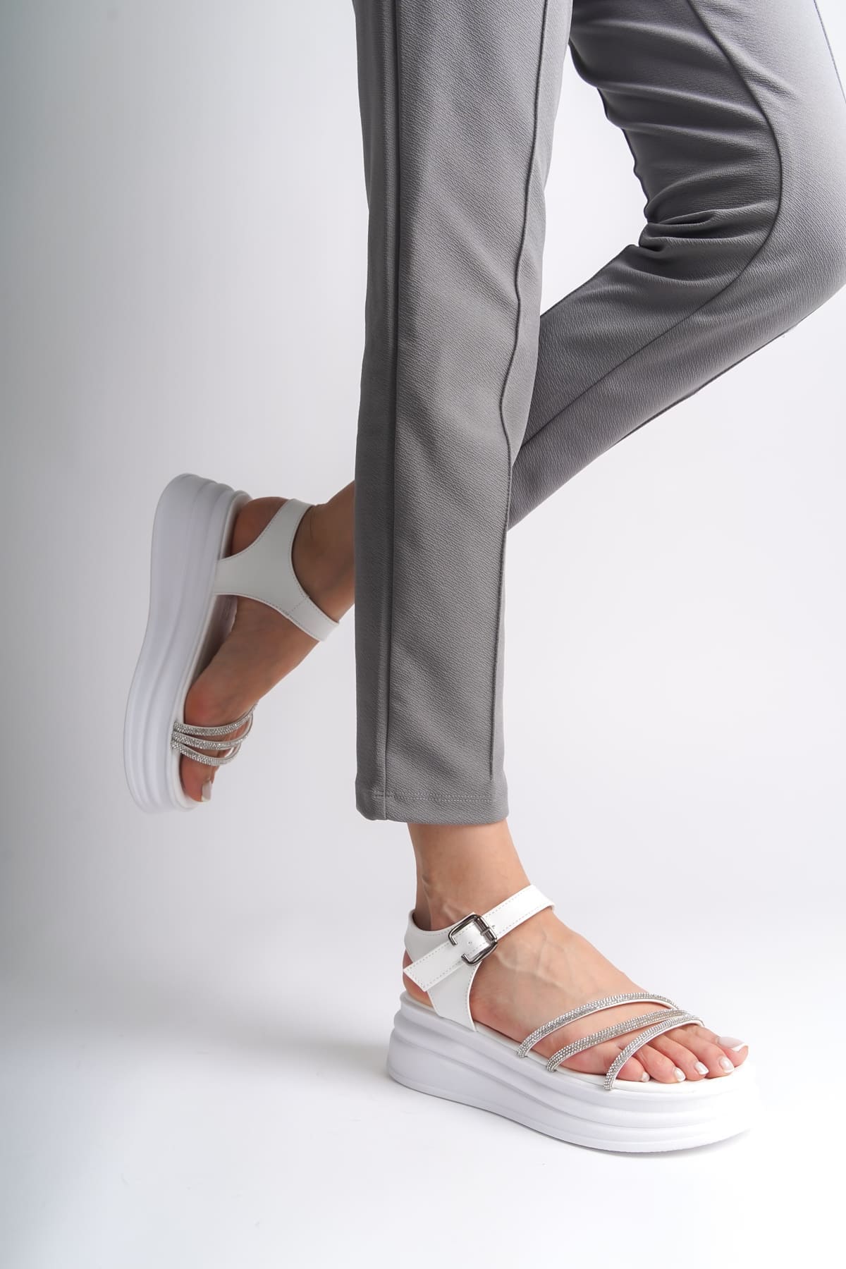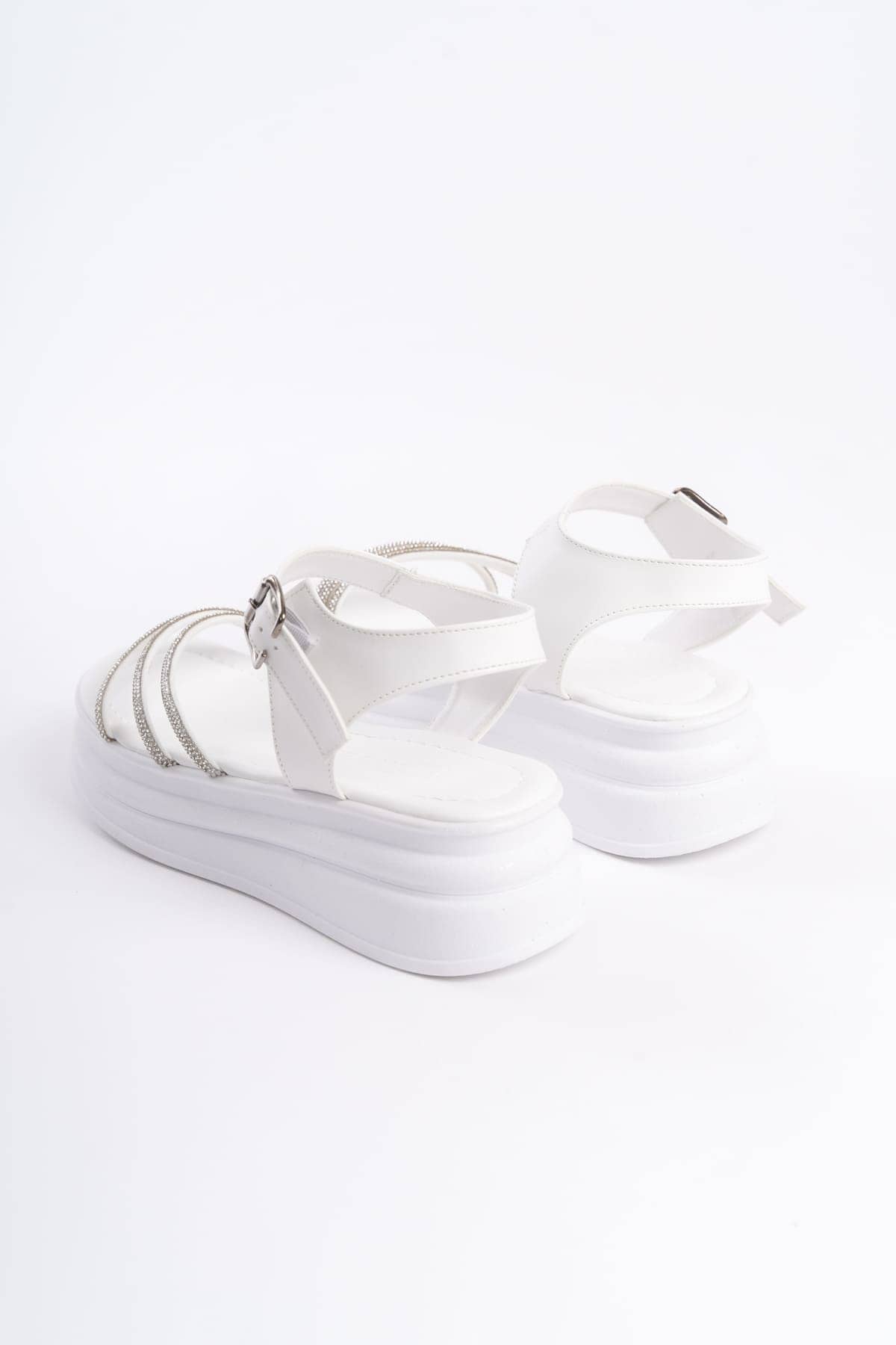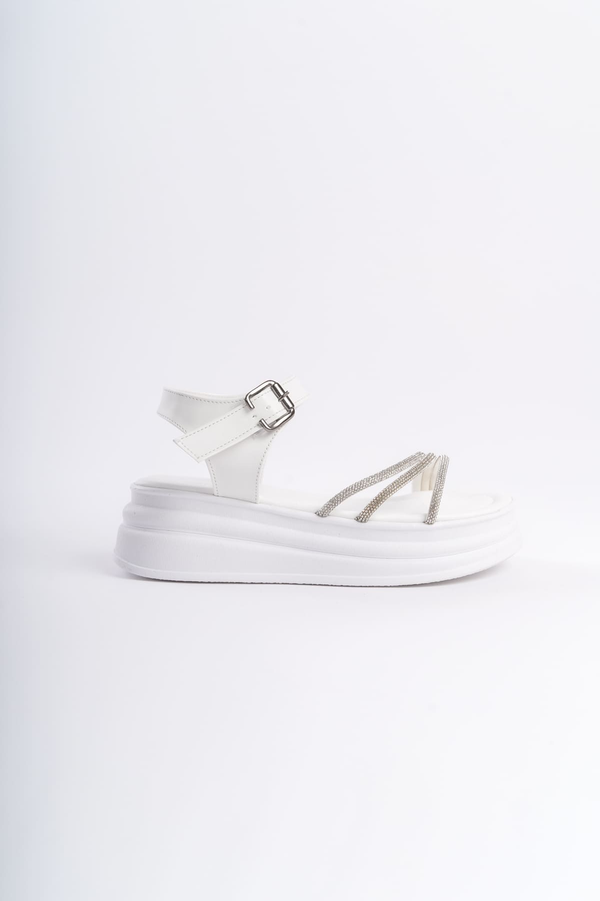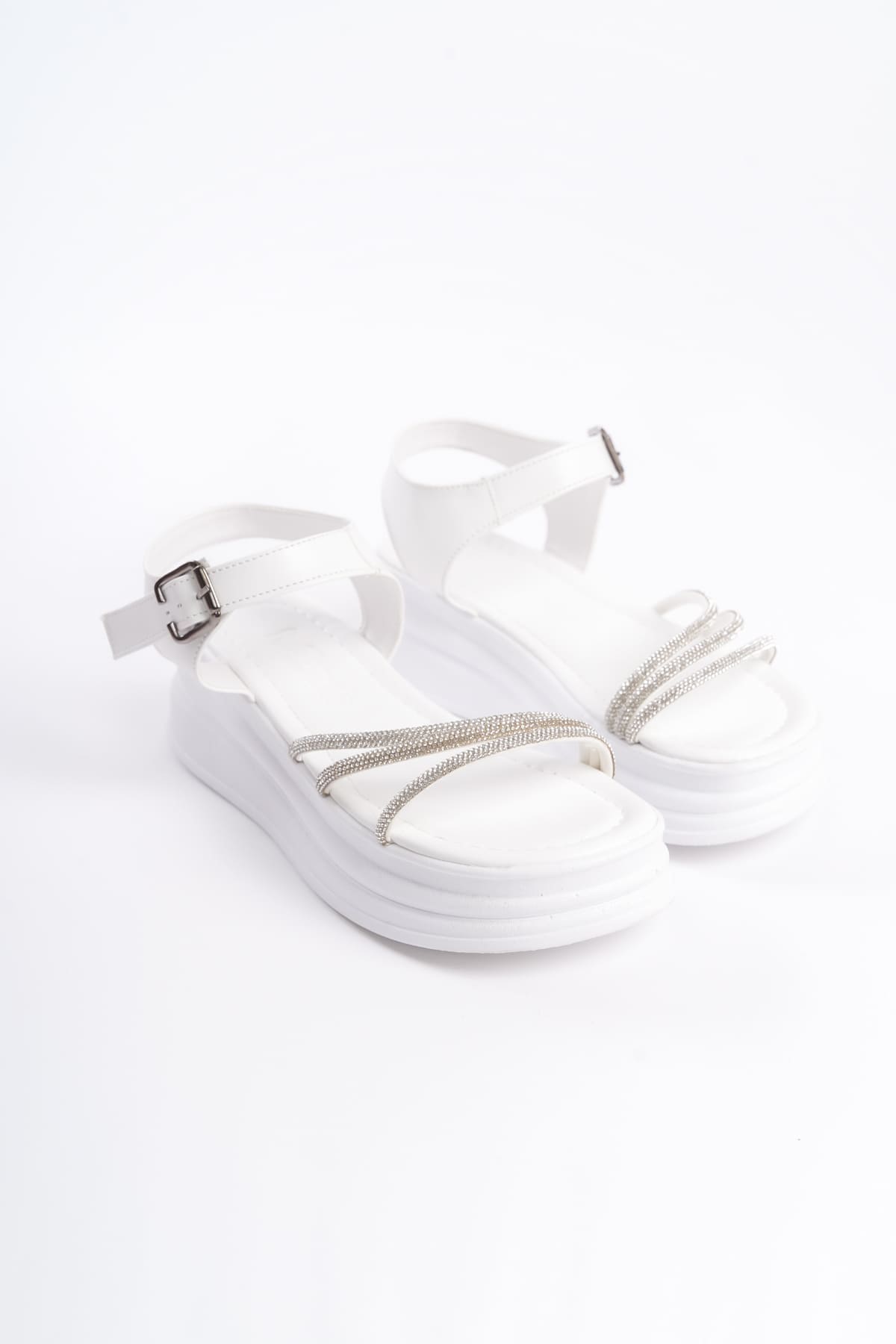 EVA Kalın Tokalı Taşlı Şeritli Ortopedik Taban Kadın Sandalet CBT – Beyaz