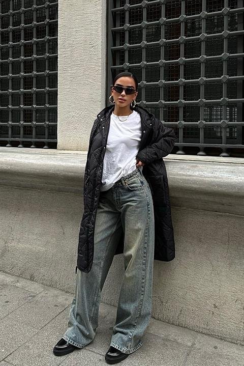Fermuar Ve Kapşonlu Uzun Kapitone Mont 7062