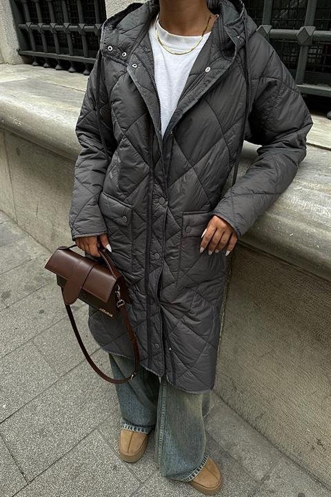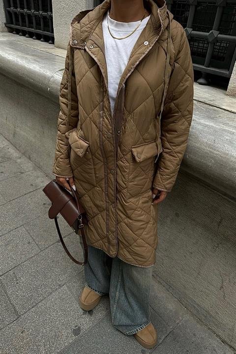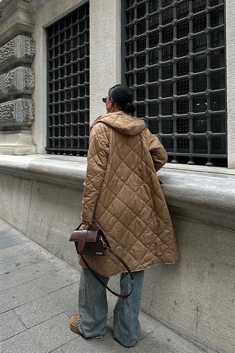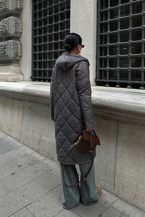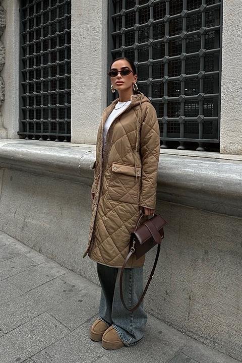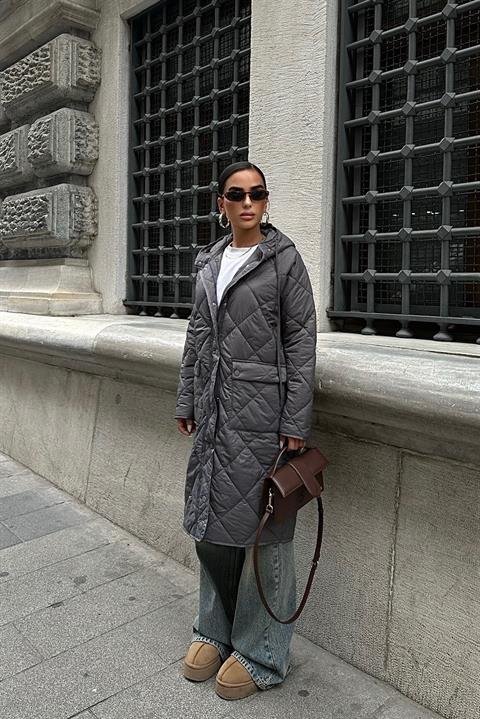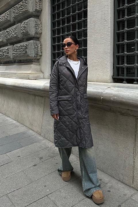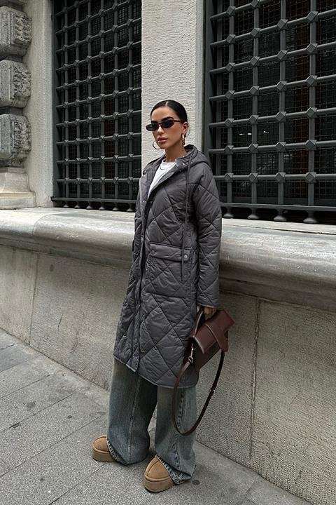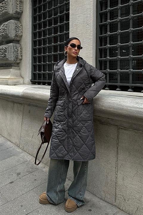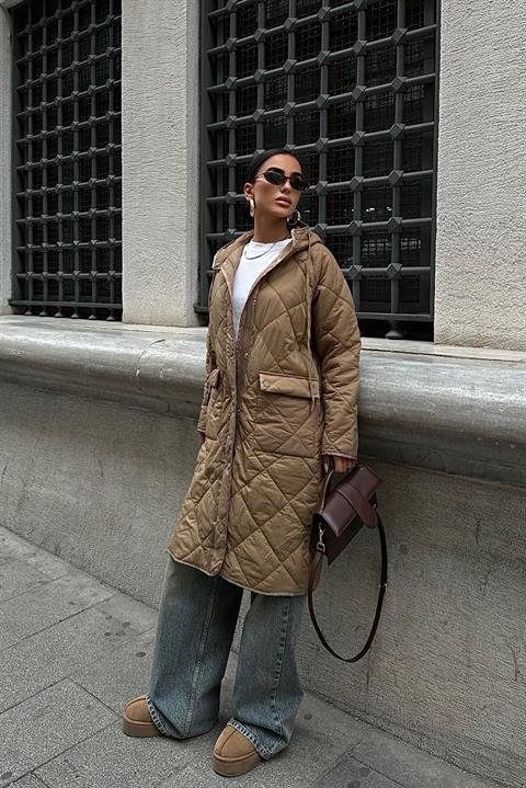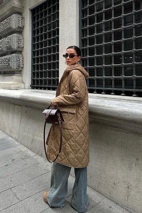 Fermuar Ve Kapşonlu Uzun Kapitone Mont 7062