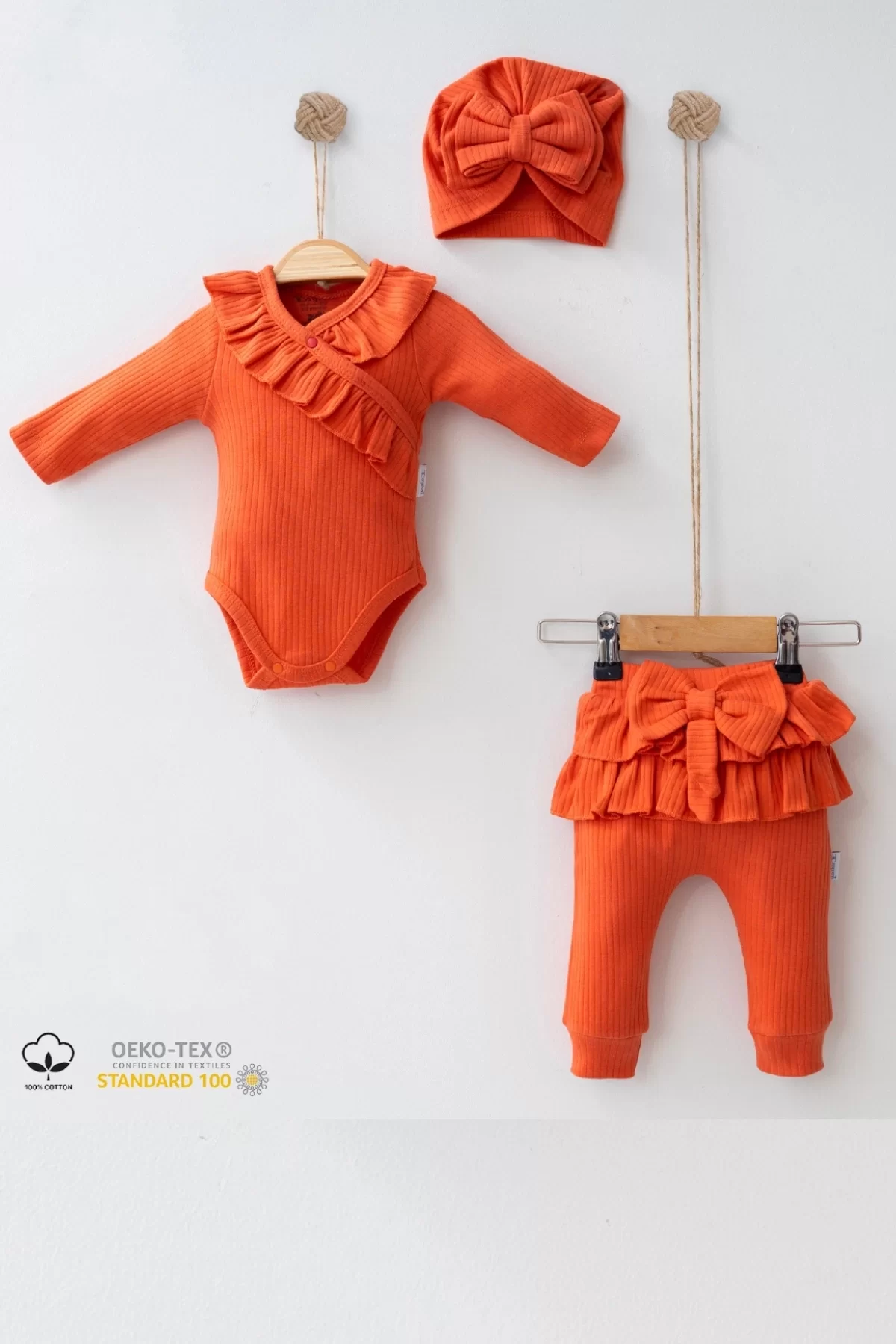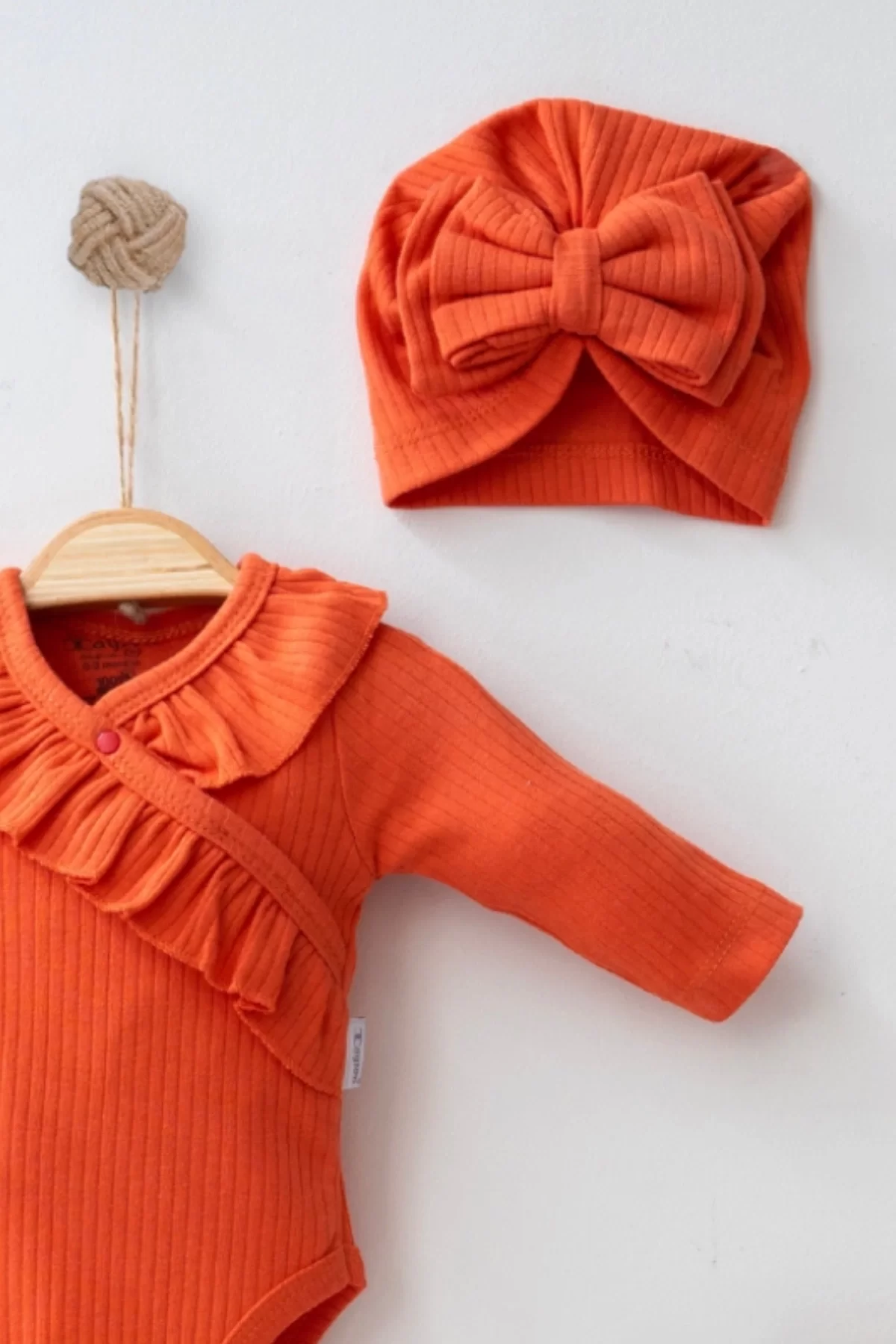 Fırfır Detaylı Fiyonk Boneli % 100 Pamuklu Kız Bebek Takımı