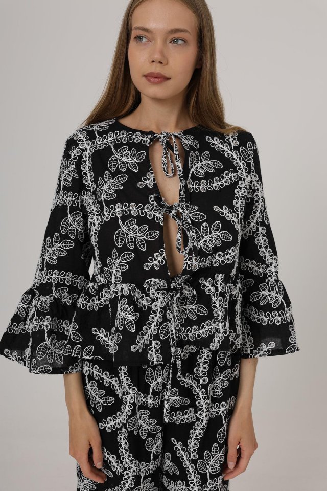 Fiyonk Bağlamalı Brode Bluz – Siyah