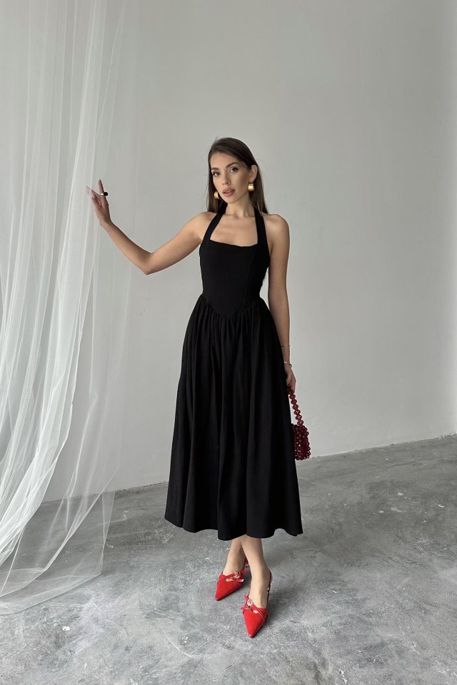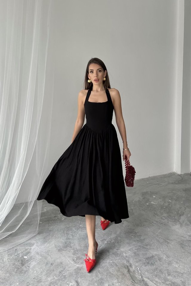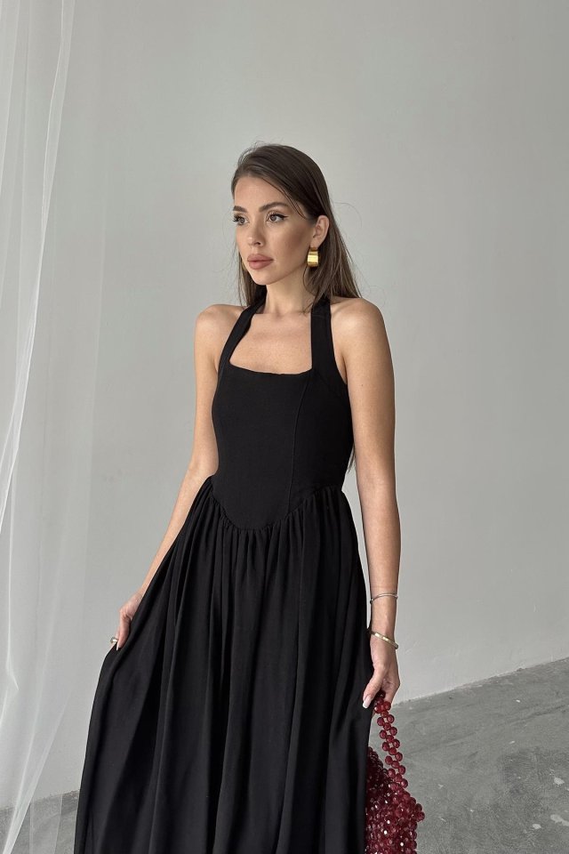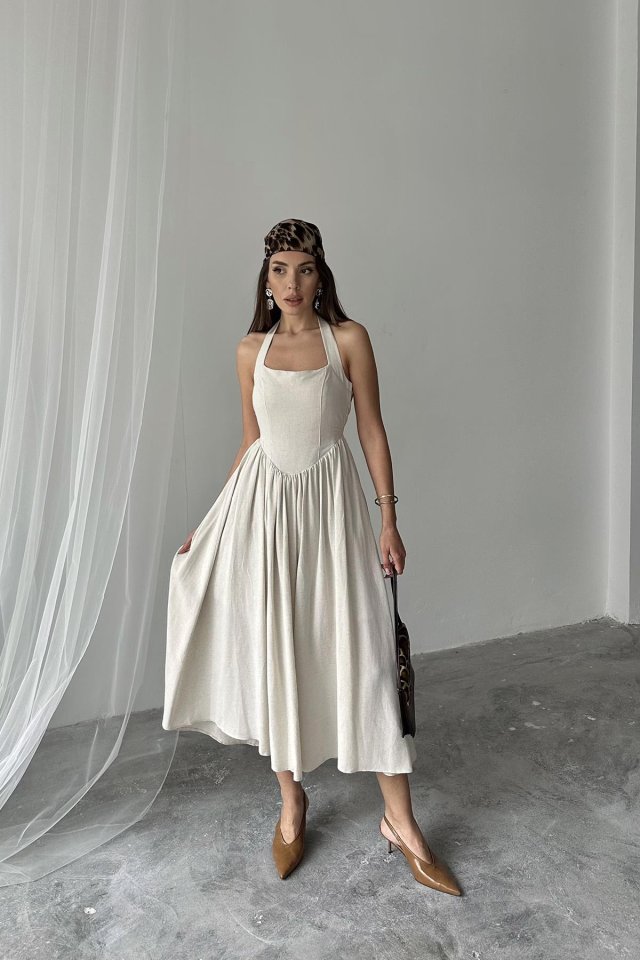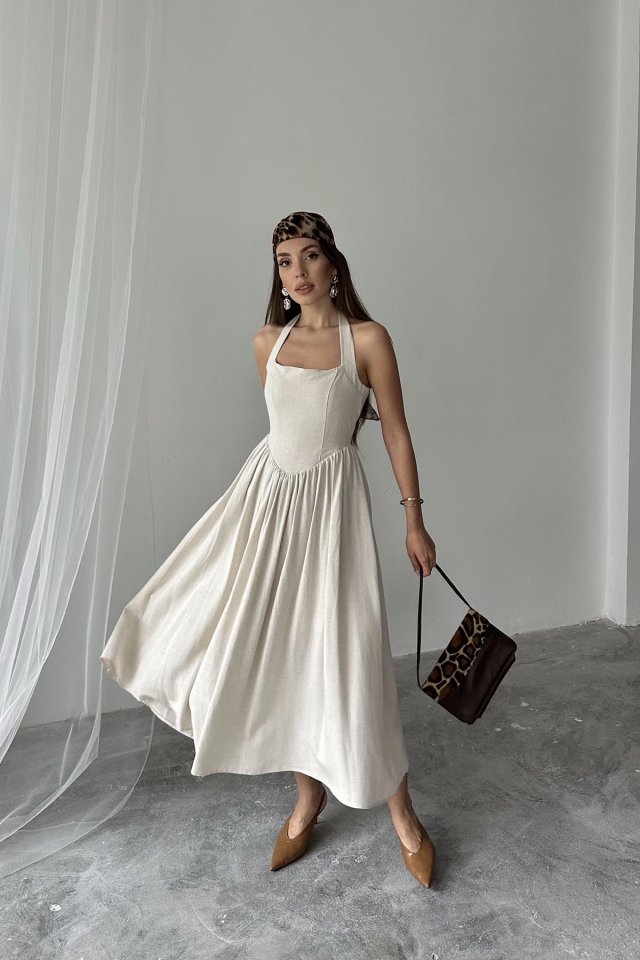 Fuşya Boyundan Bağlamalı Keten Elbise