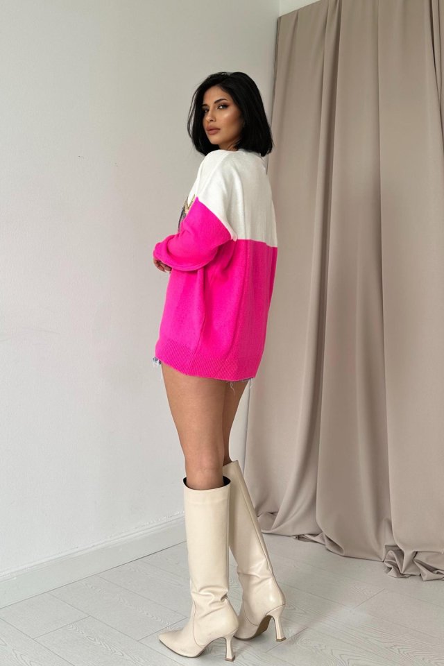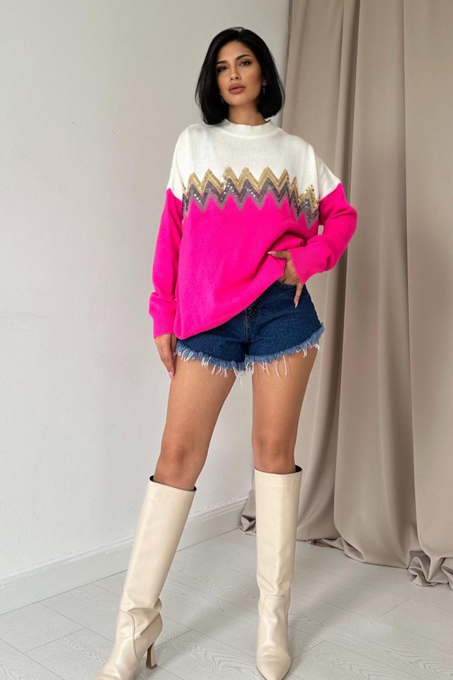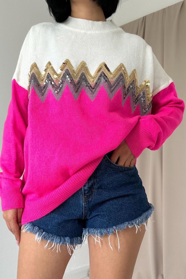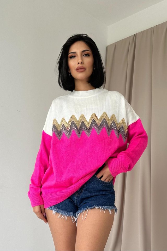 Fuşya Zikzak Desenli Triko Kazak