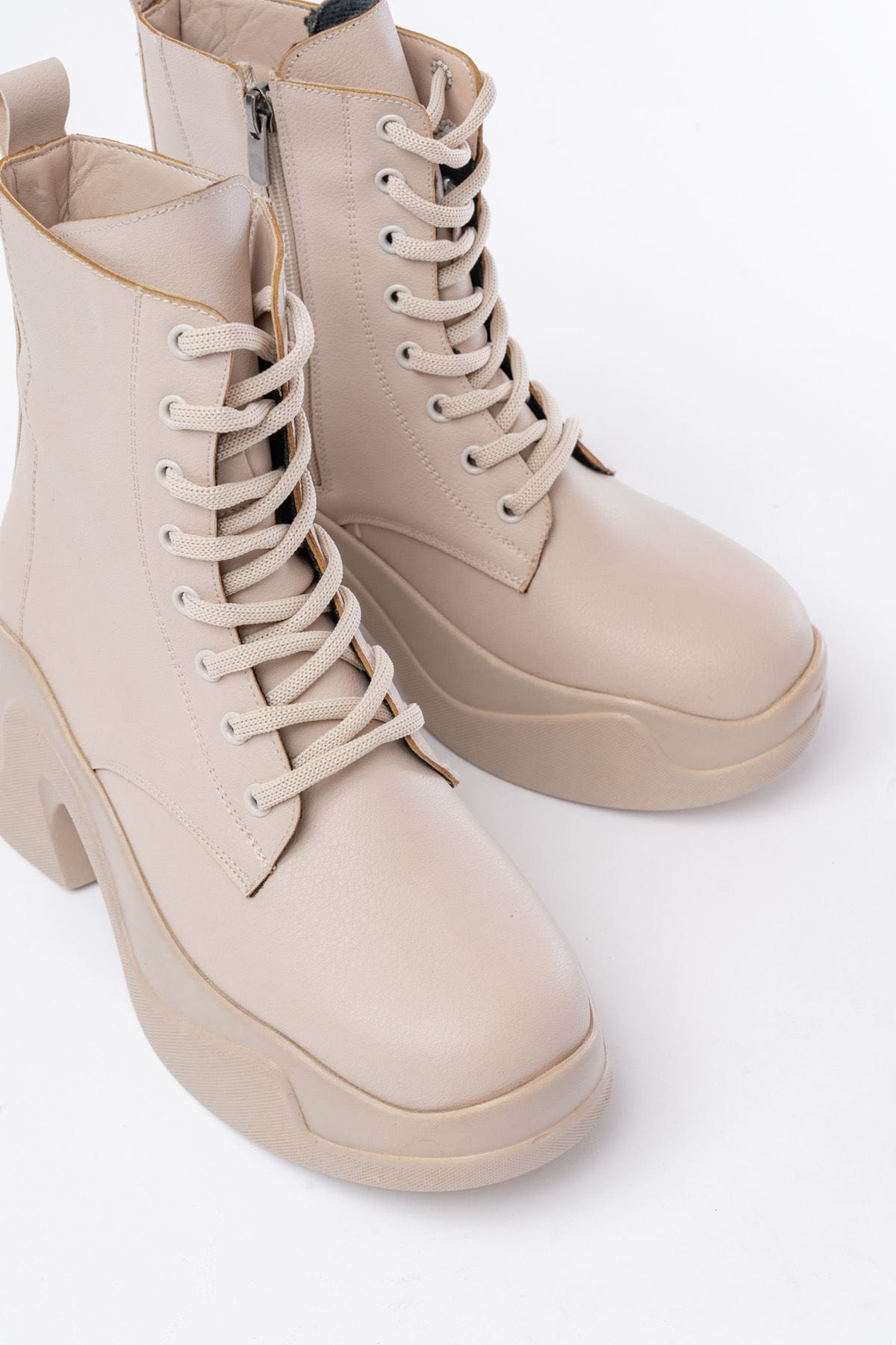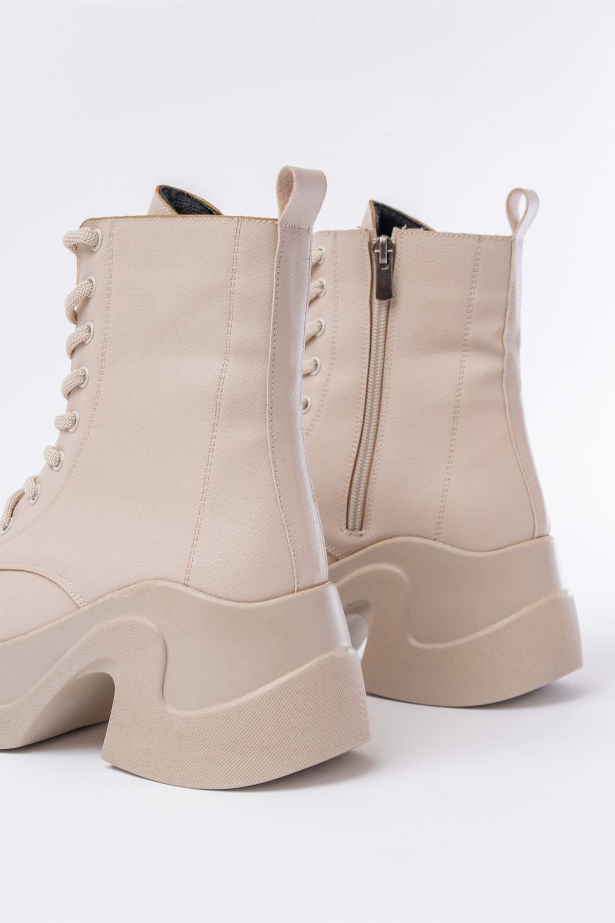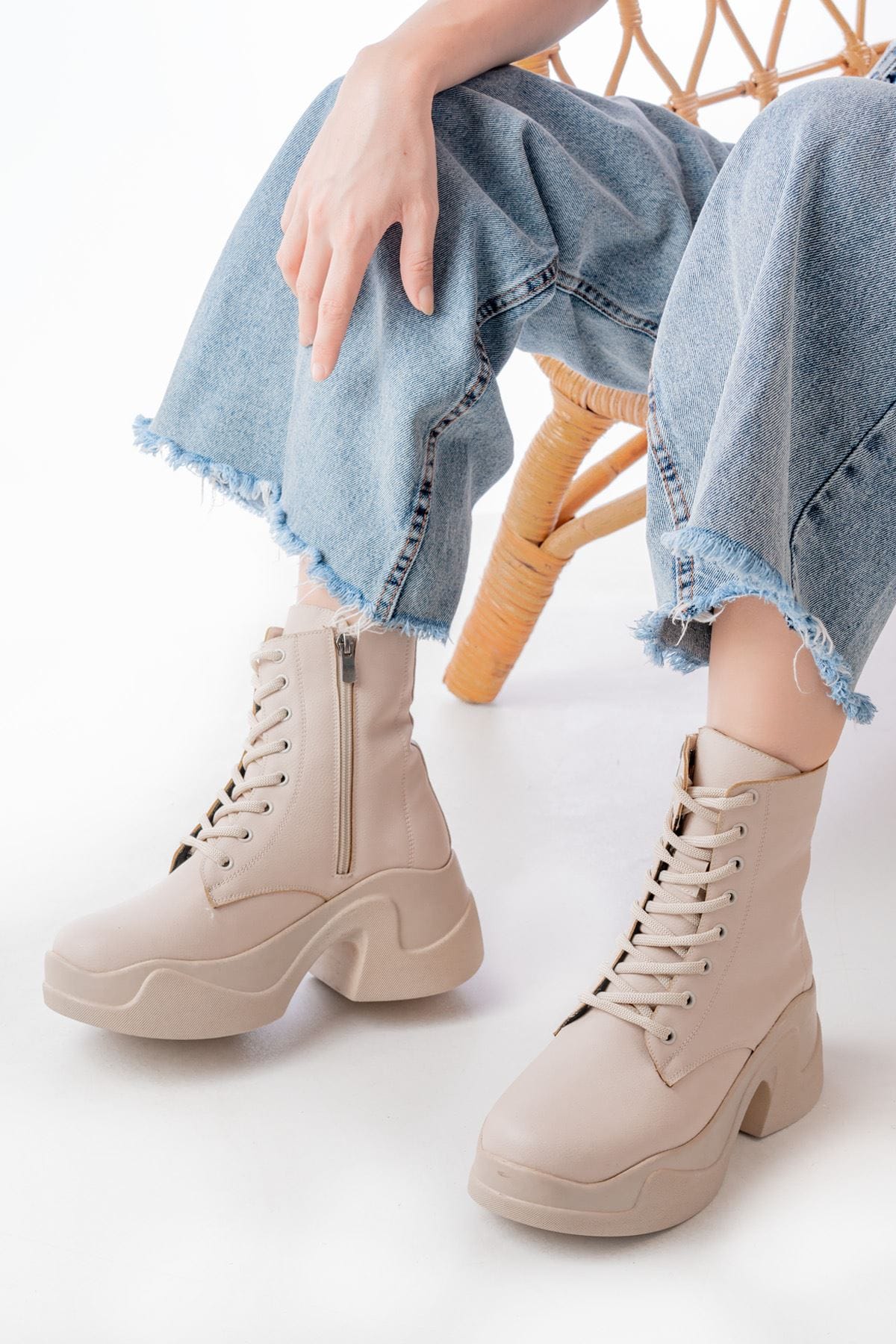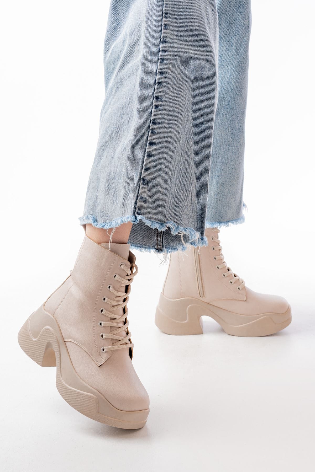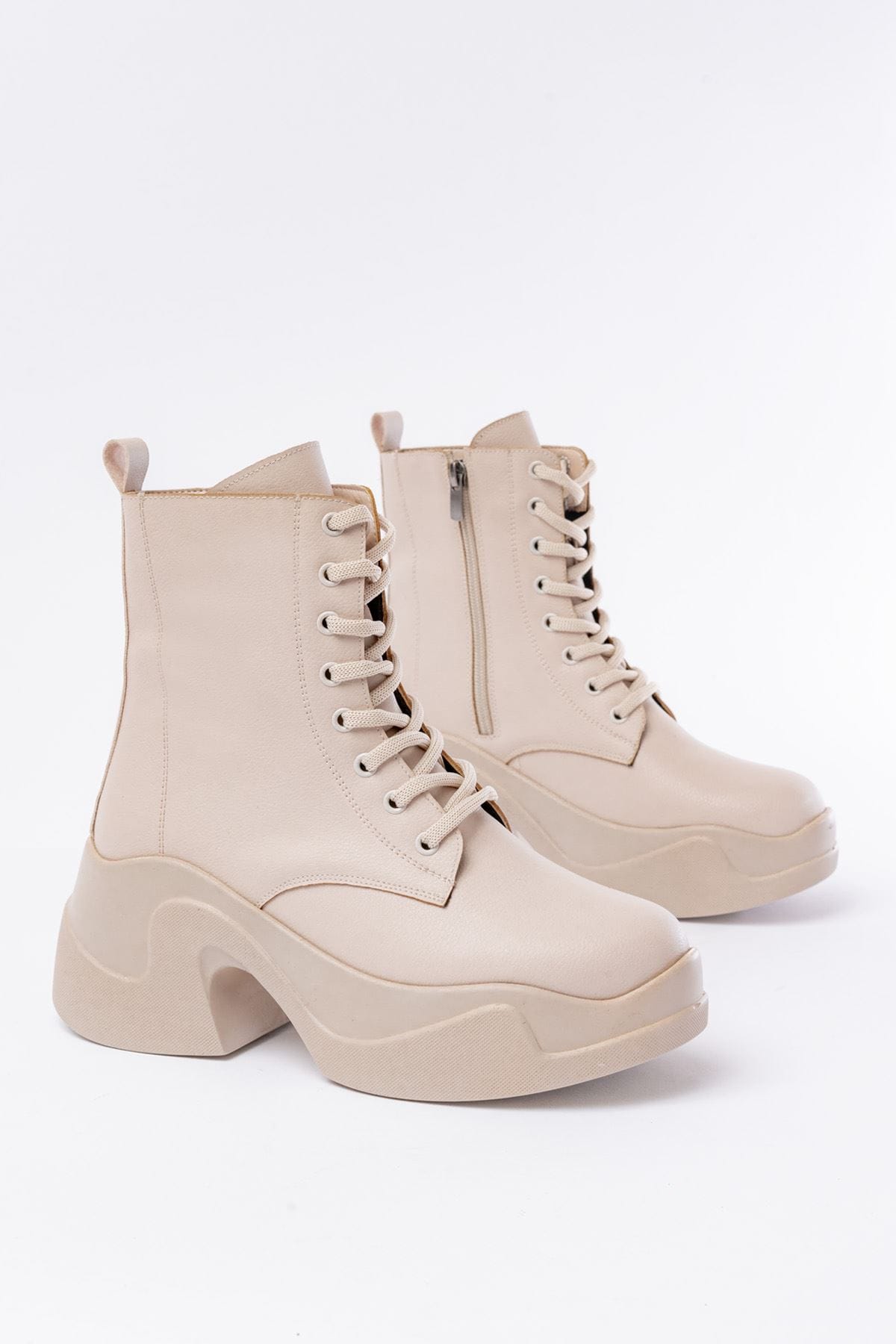 FZ-2550 Bej Yüksek Tabanlı Bağcıklı Fermuarlı Günlük Kadın Bot