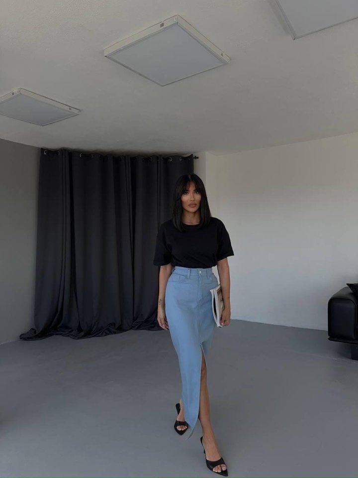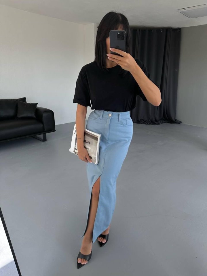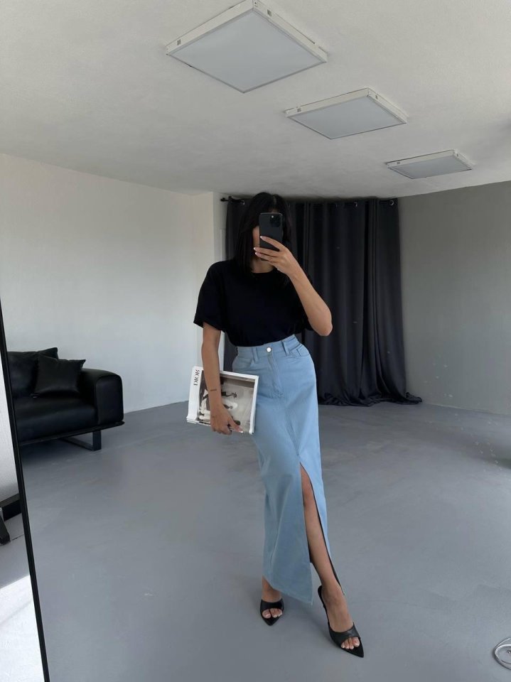 GABARDİN UZUN ÖNDEN YIRTMAÇLI ETEK – Mavi