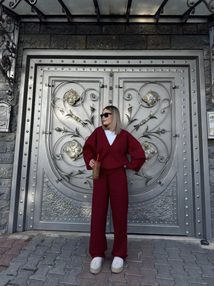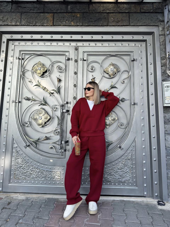 Geniş V Yaka Üç İplik Sweat Takım – Bordo