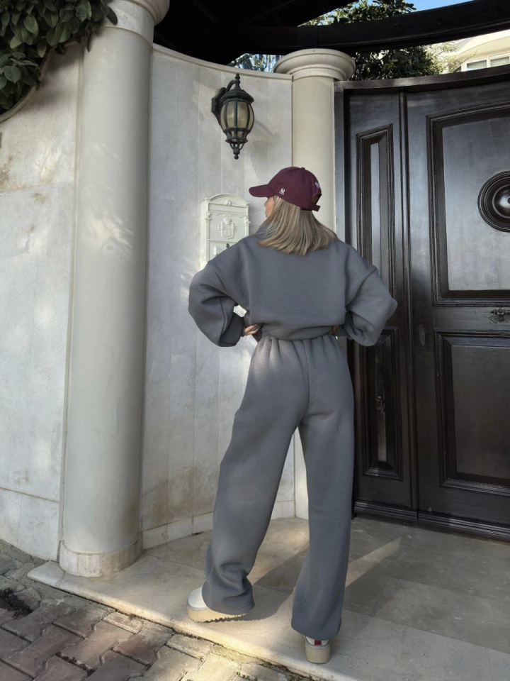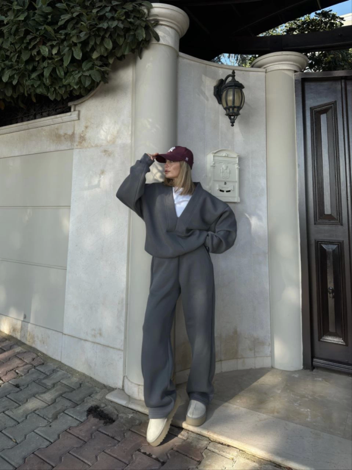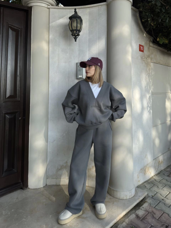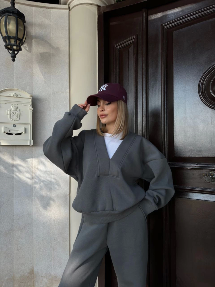 Geniş V Yaka Üç İplik Sweat Takım – Füme