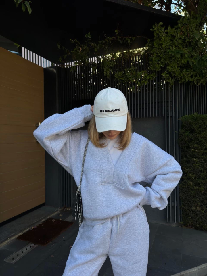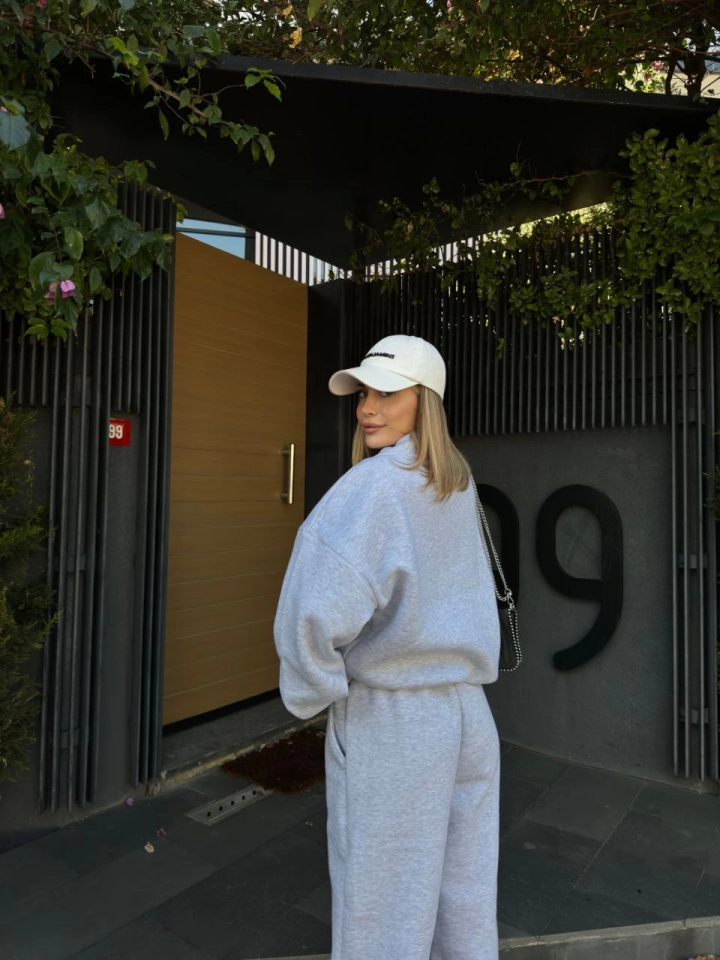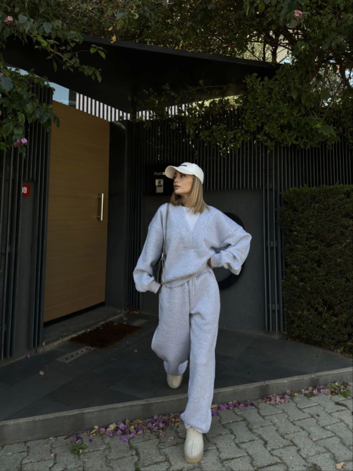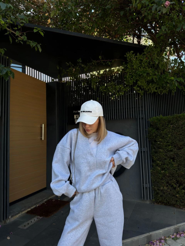 Geniş V Yaka Üç İplik Sweat Takım – Gri