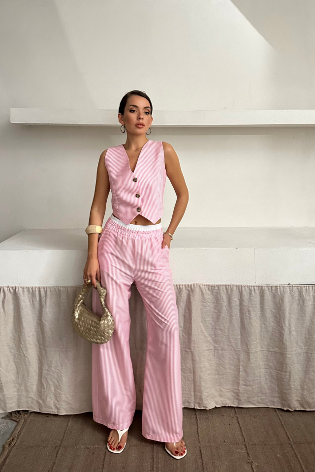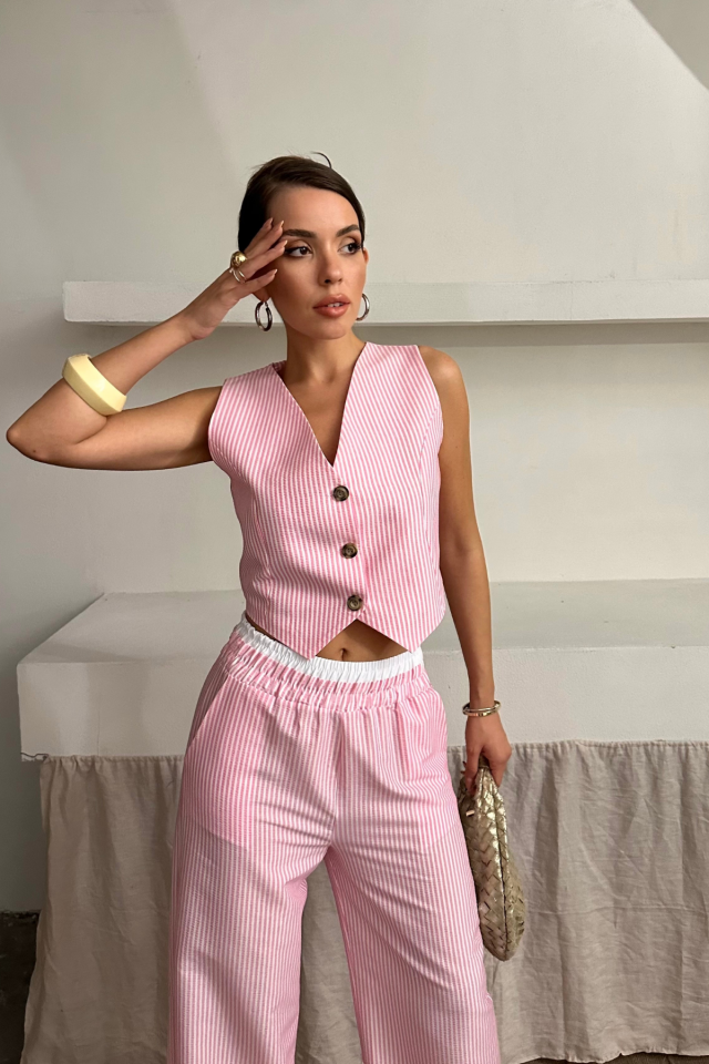 GOFRE ÇİZGİLİ YELEK – PANTOLON TAKIM – Pembe