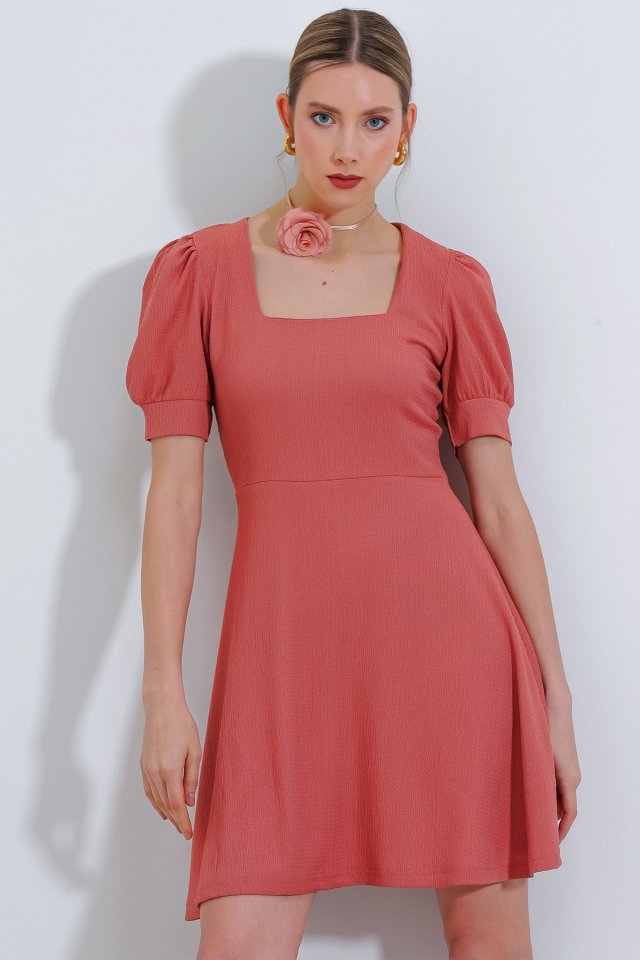 Gül Kurusu Kare Yaka Örme Mini Elbise