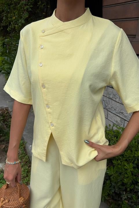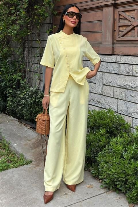 Hakim Yaka Çapraz Düğmeli Plazzo Pantolon Viscon Keten Takım 10209