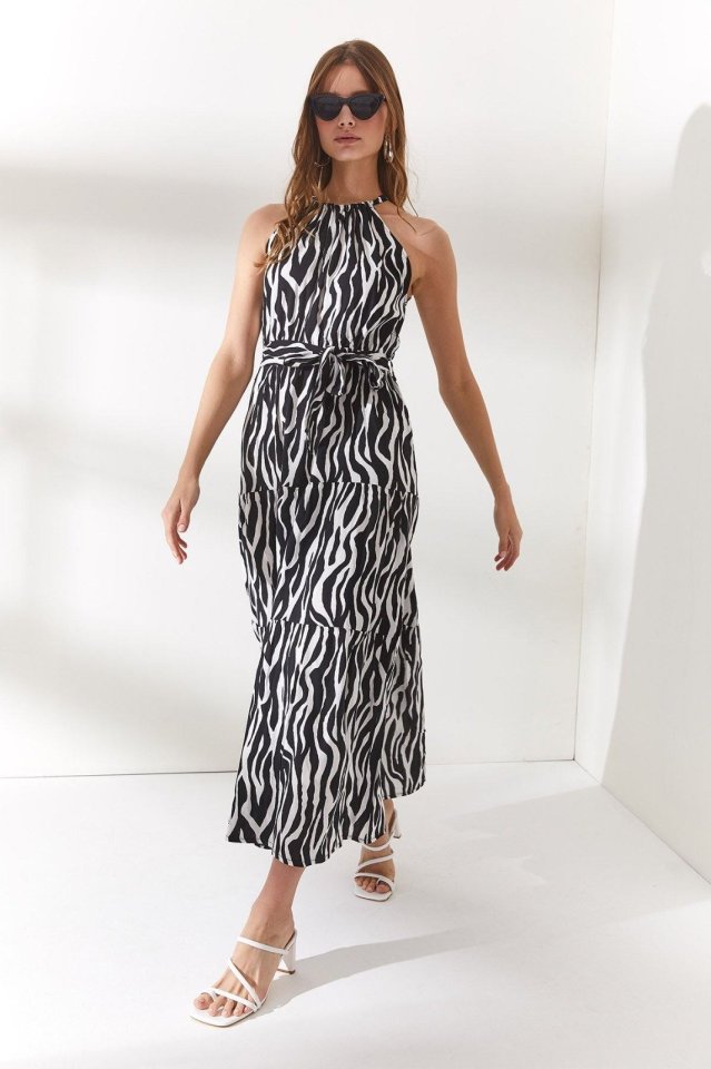 Halter Yaka Kuşaklı Dokuma Viscon Elbise