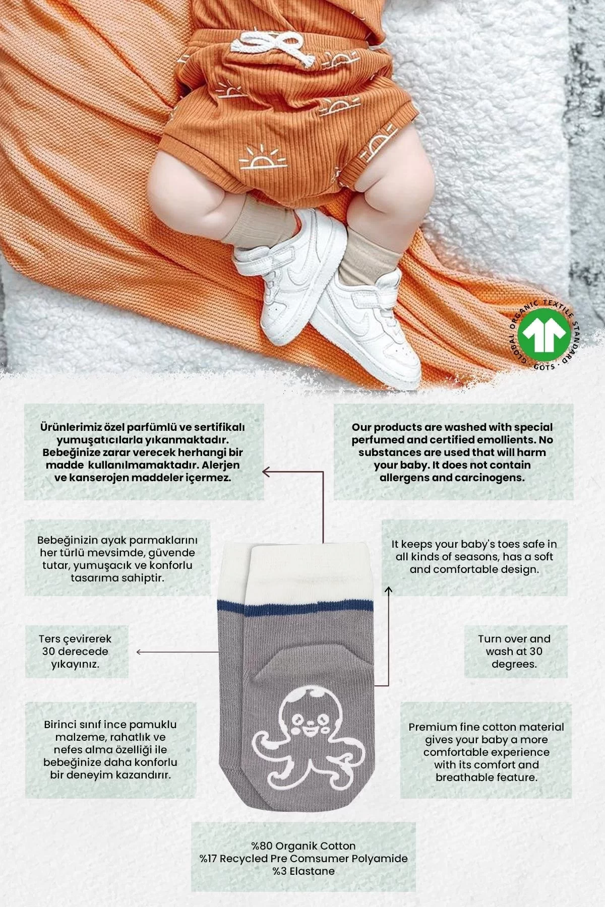 Yumuşak, nefes alabilir, nem emici ve kokulu Bistil çoraplarımız minik bebekleriniz için özenle üretilmiştir.