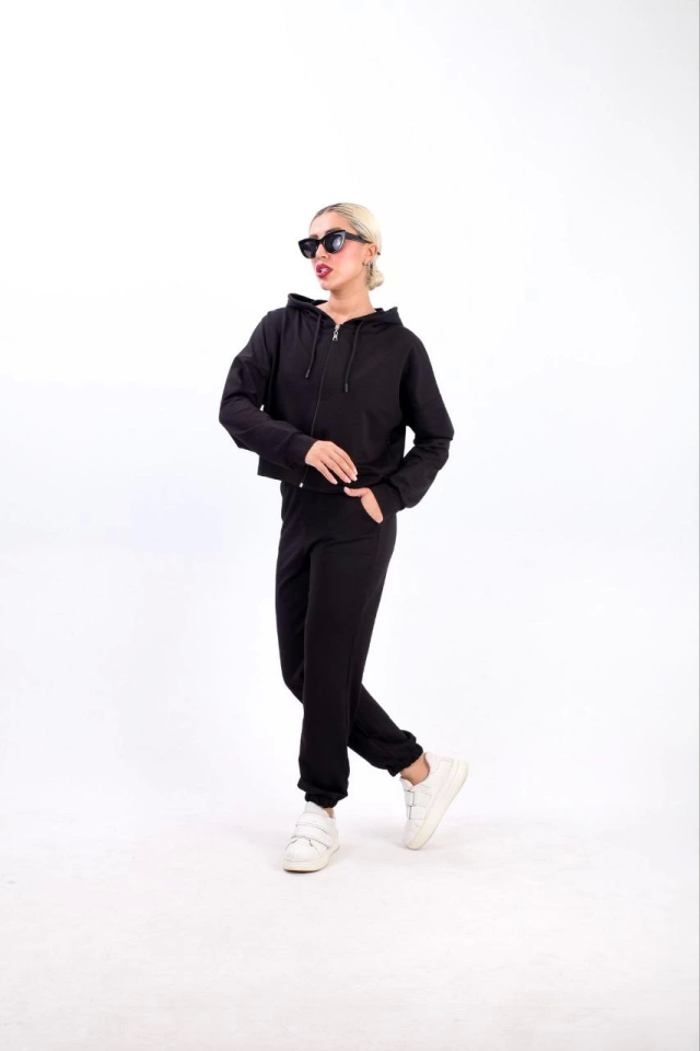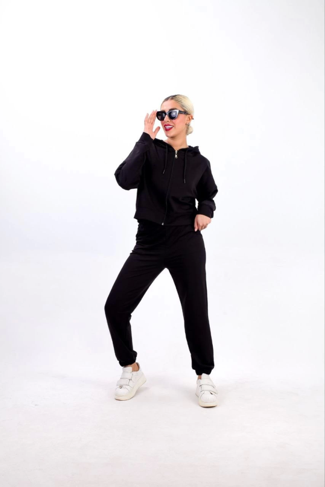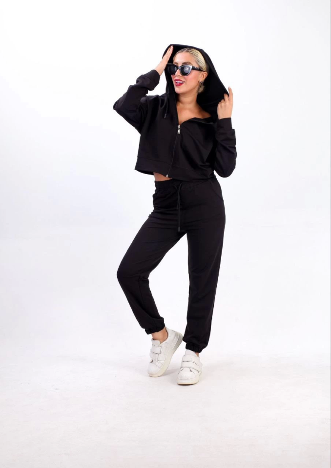 Iki Iplik Kapüşonlu Fermuarlı Crop Oversize Hırka Takım- Siyah