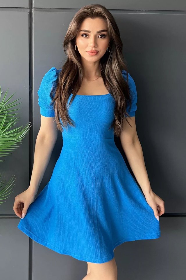 İndigo Kare Yaka Örme Mini Elbise