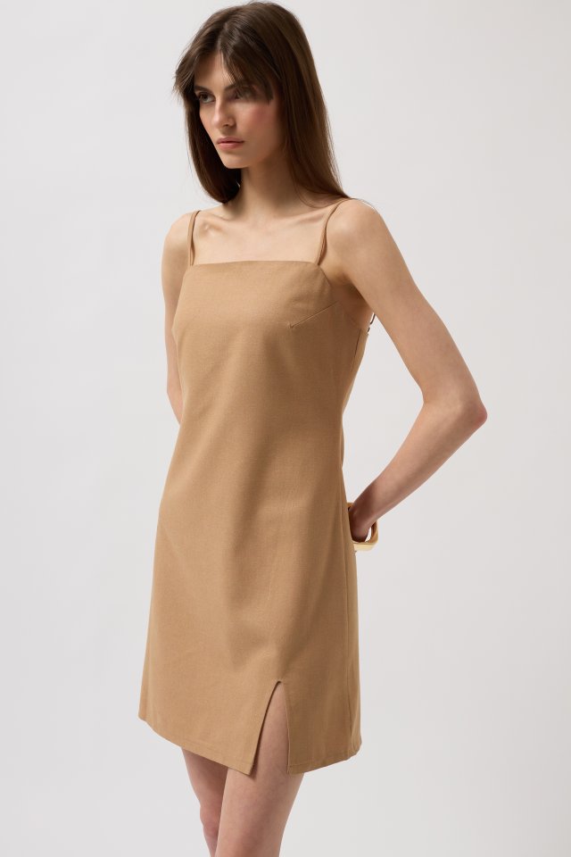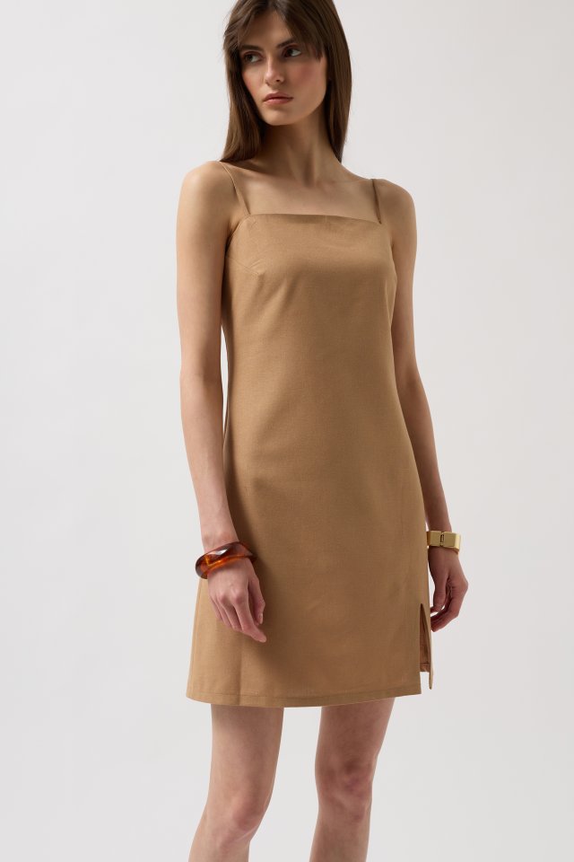 İp Askılı Yırtmaç Detay Keten Mini Elbise