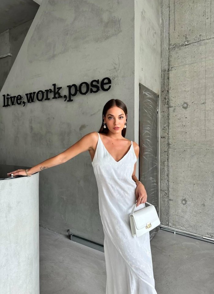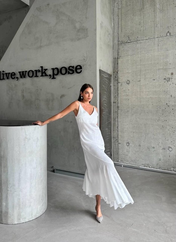 JAKARLI ASKILI SATEN ELBİSE ASİMETRİK – Beyaz