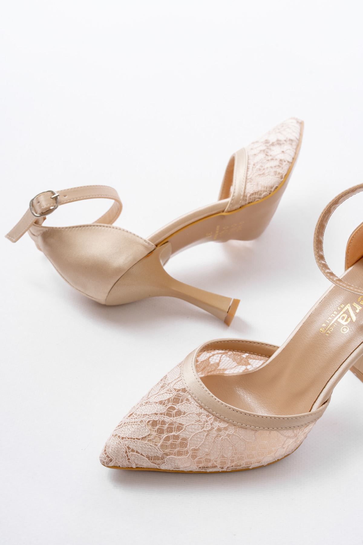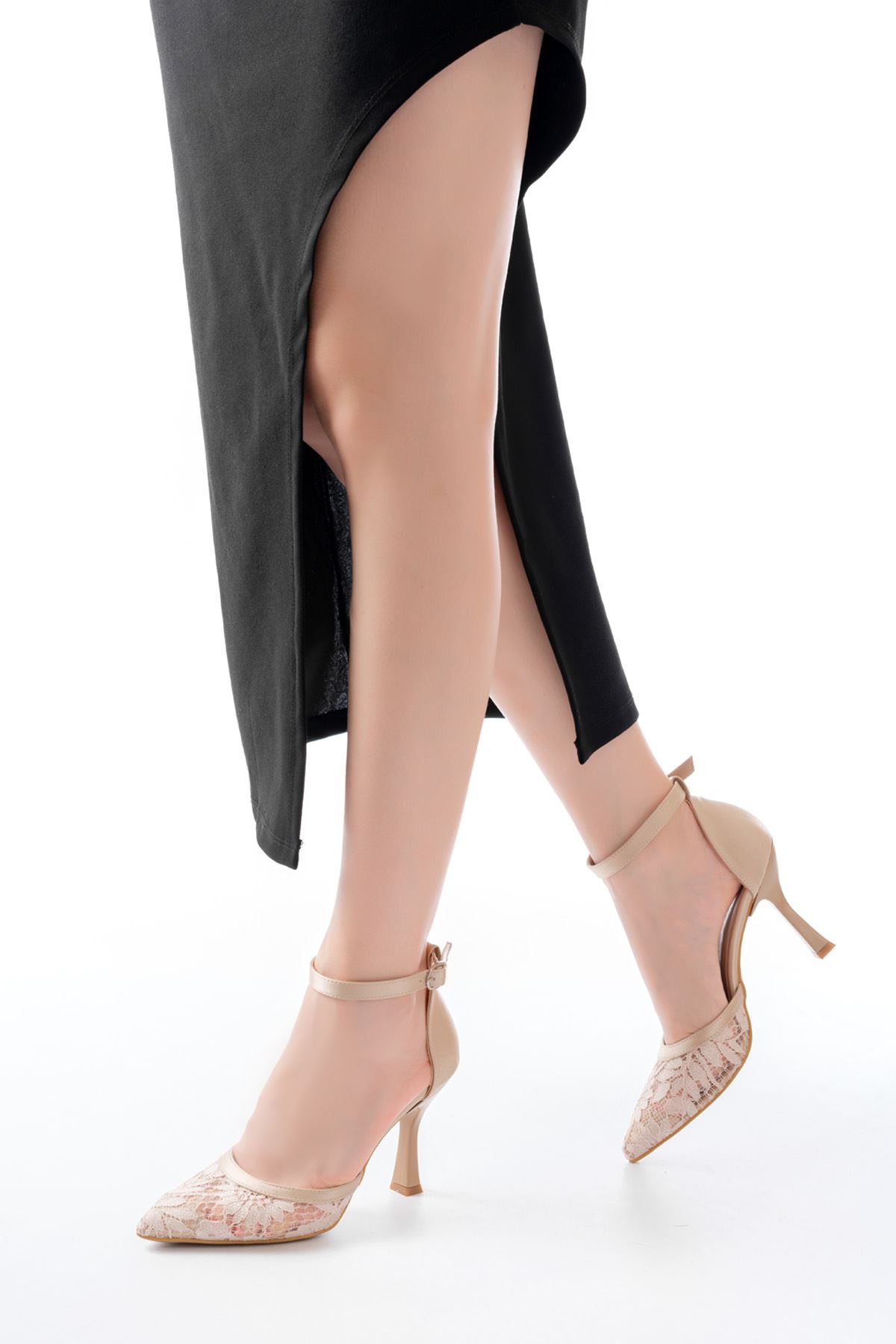 K-404 Bej Fileli Çiçek Detaylı Kadın Topuklu Ayakkabı