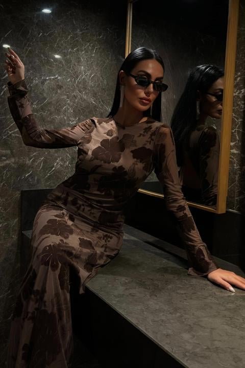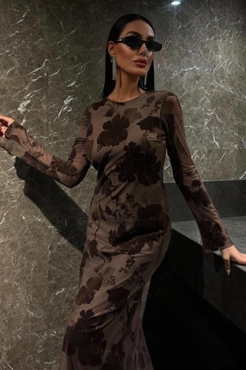 Kadife Baskılı Sırt Dekolteli Astarlı Elbise 2825