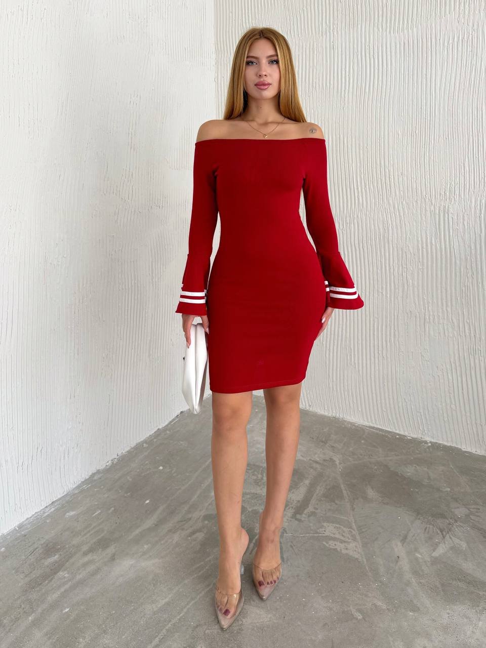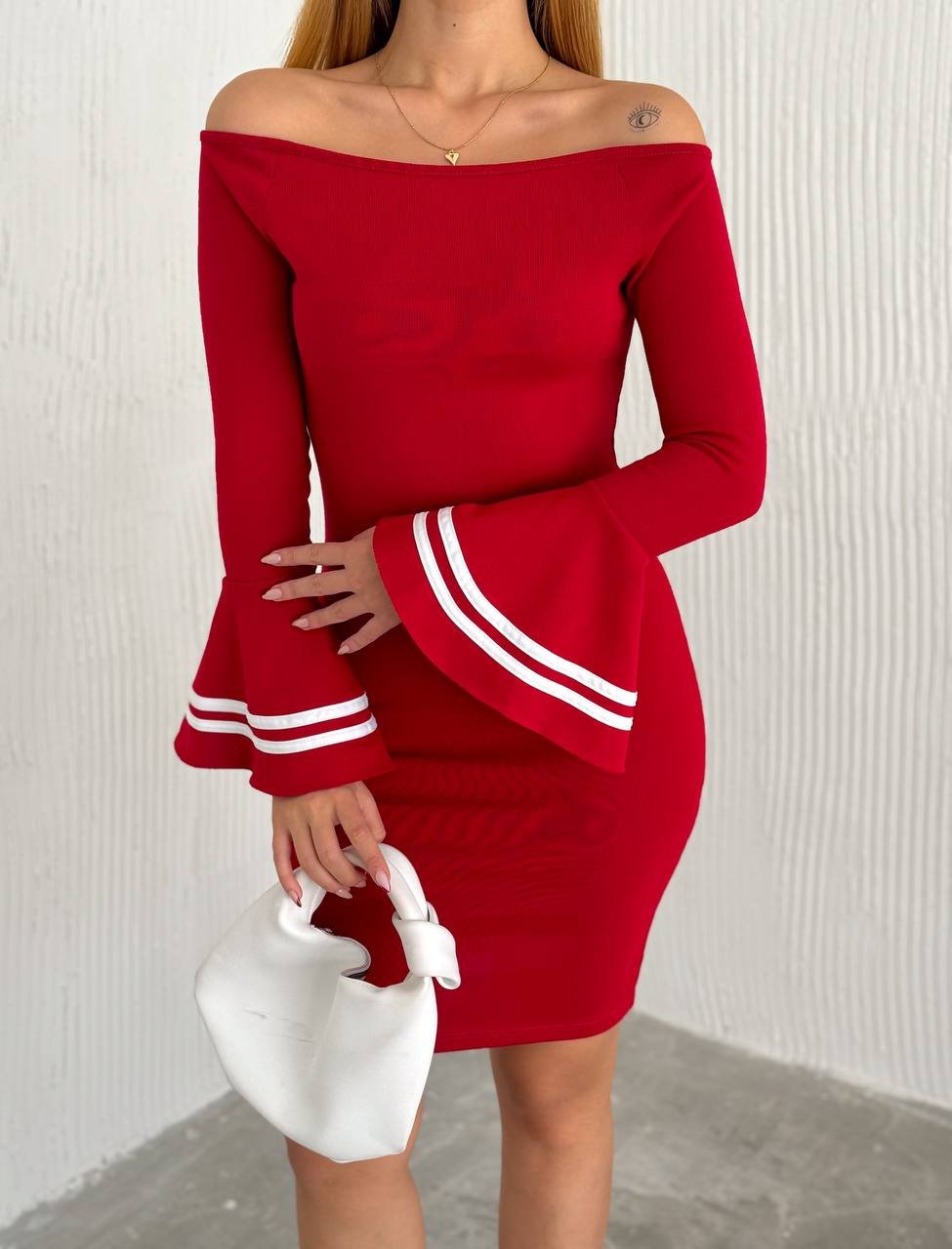 Kadın Akrilik Kumaş Ispanyol Kol Madonna Yaka Mini Elbise