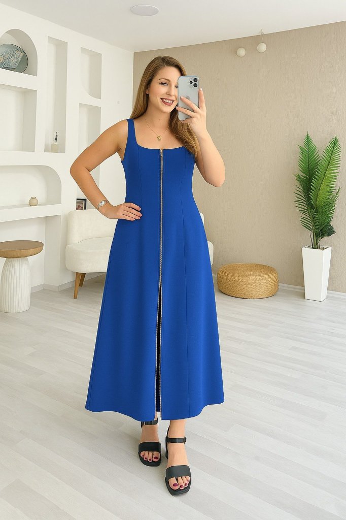 Kadın Askılı Kare Yaka önden Fermuarlı Geniş Kesim Janjan Krep Elbise
