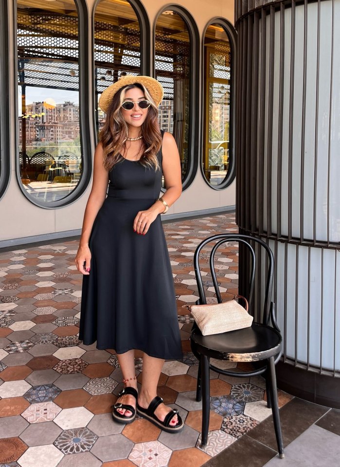 Kadın Askılı Kare Yakalı Midi Ithal Krep Elbise