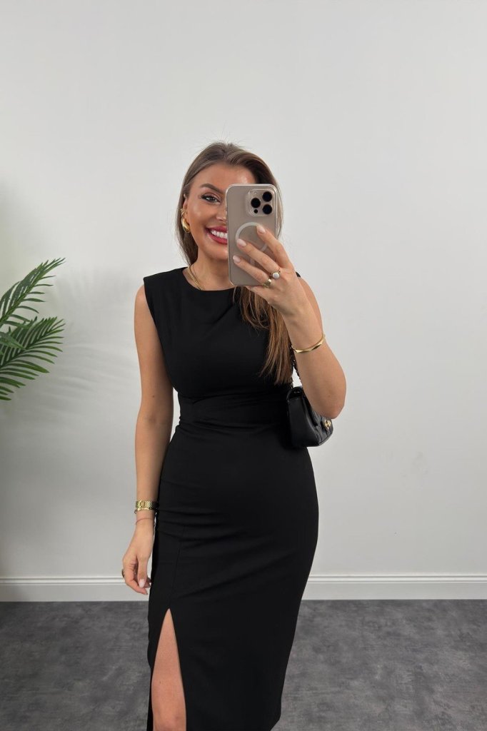 Kadın Askılı Kolsuz Belden Büzgülü Yırtmaçlı Midi Janjan Krep Elbise