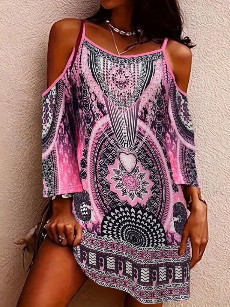 Kadın Askılı Omuzlardan Açık Fakir Kol Desenli Kısa Süprem Elbise