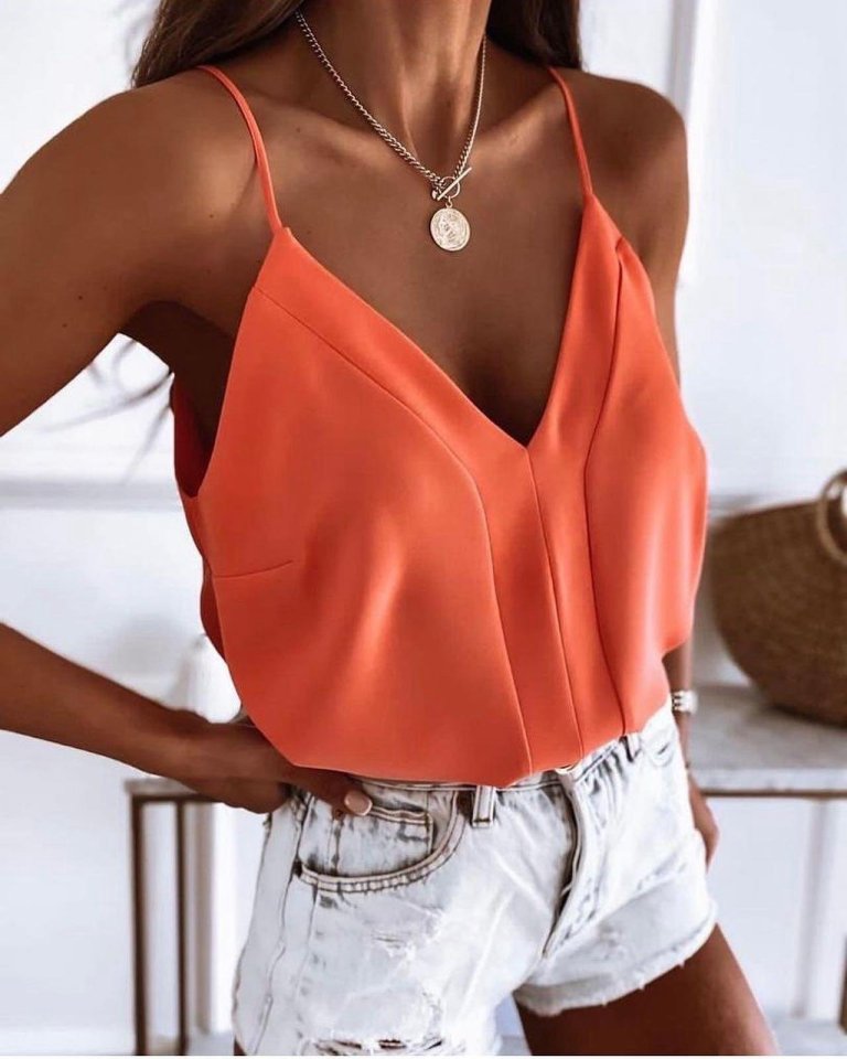 Kadın Askılı V Yaka Detay Sandy Kumaş Bluz