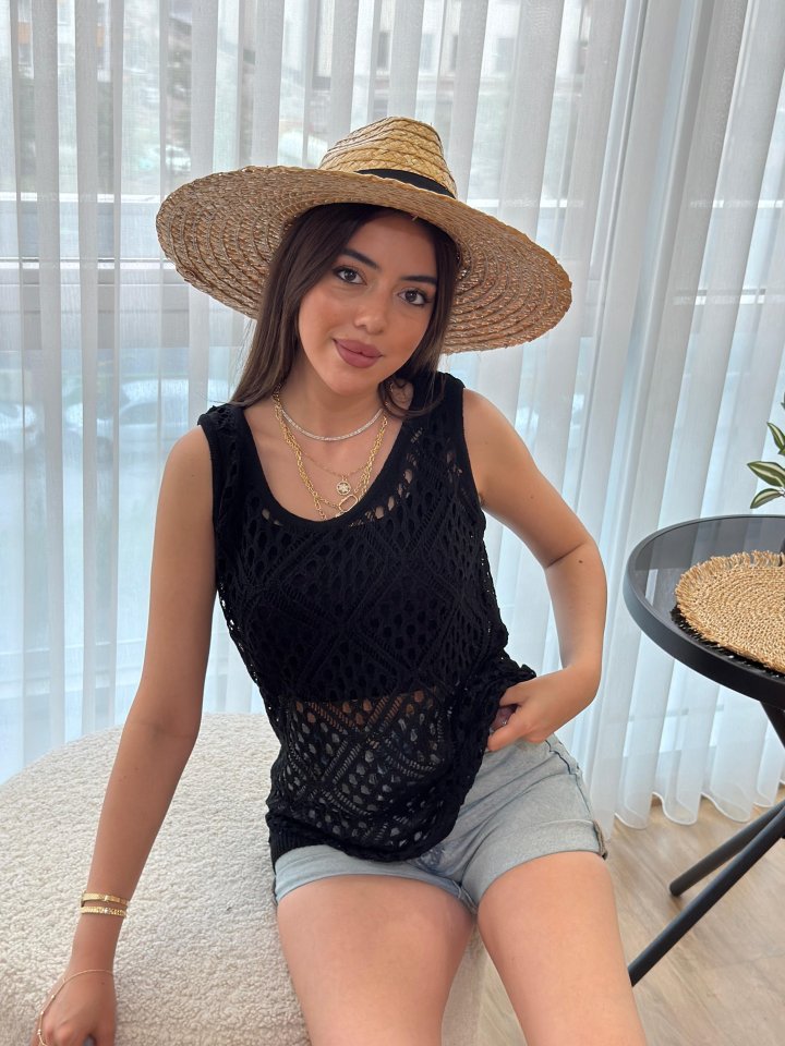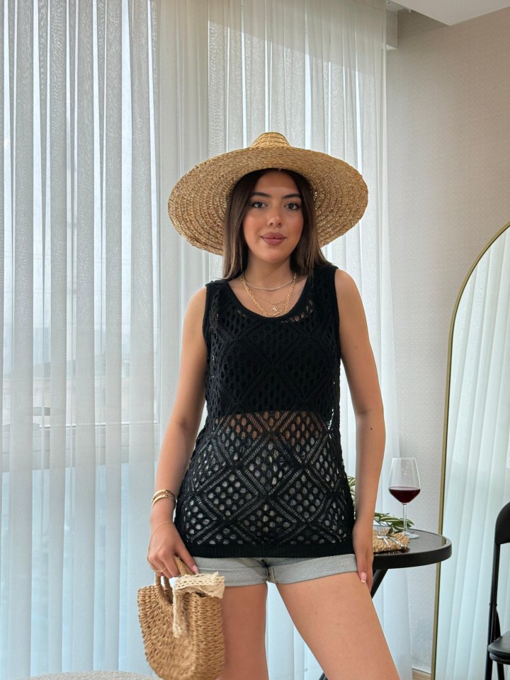 Kadın Askılı Yuvarlak Yaka Geometrik Desenli Triko Bluz