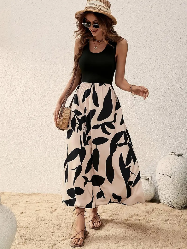 Kadın Askılı Yuvarlak Yaka üst Viskon Alt Desenli Uzun Süprem Elbise