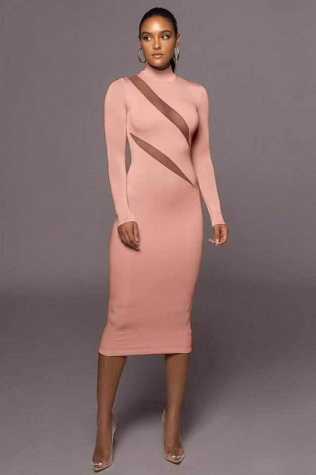Kadın Balıkçı Yaka Uzun Kollu Asimetrik Tül Dekolteli Dırsat ürün Midi Boy Elbise
