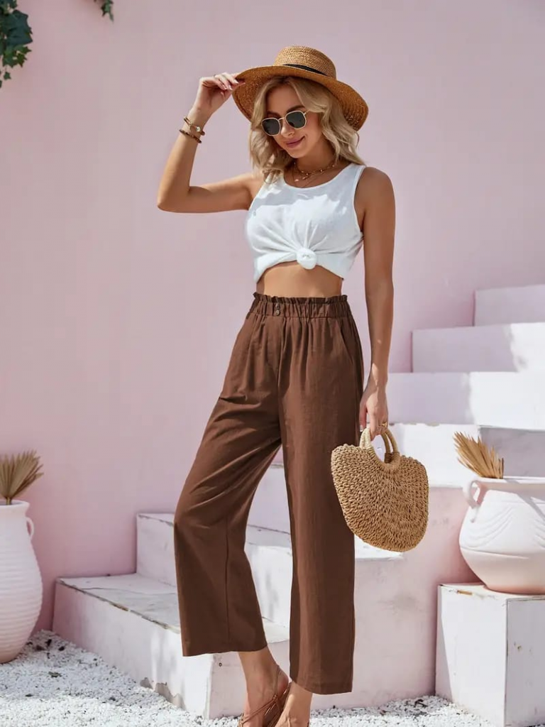 Kadın Bel Büzgü Ve Düğme Detay Kapri Keten Pantolon