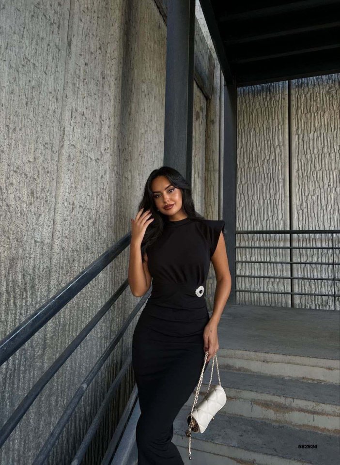 Kadın Bisiklet Yaka Vatkalı Broş Detay Kısa Kol Midi Boy Elbise