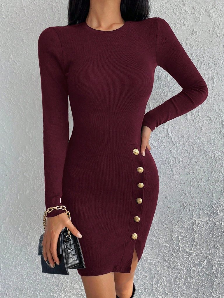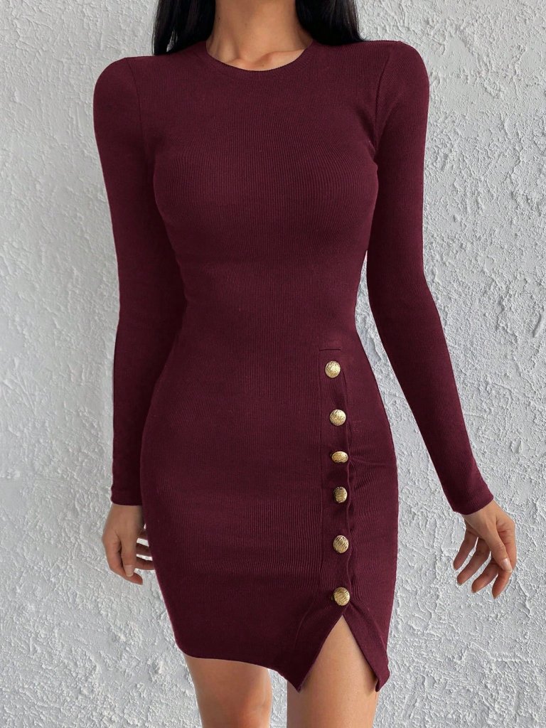 Kadın Bordo Uzun Kollu Bisiklet Yaka Yan Yırtmaç Düğme Detay Kısa Kaşkorse Elbise