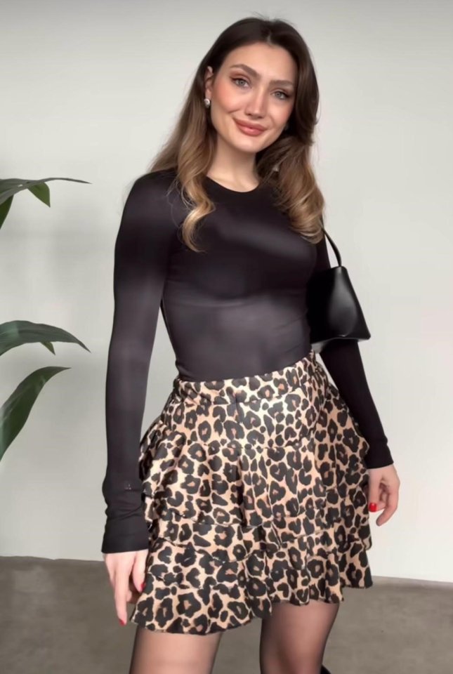 Kadın Bürümcük Kumaş Fırfırlı Leopar Desenli Etek