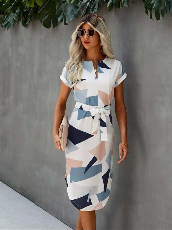 Kadın çentik Yaka Geometrik Desen Baskılı Mikro Kumaş Midi Moy Elbise