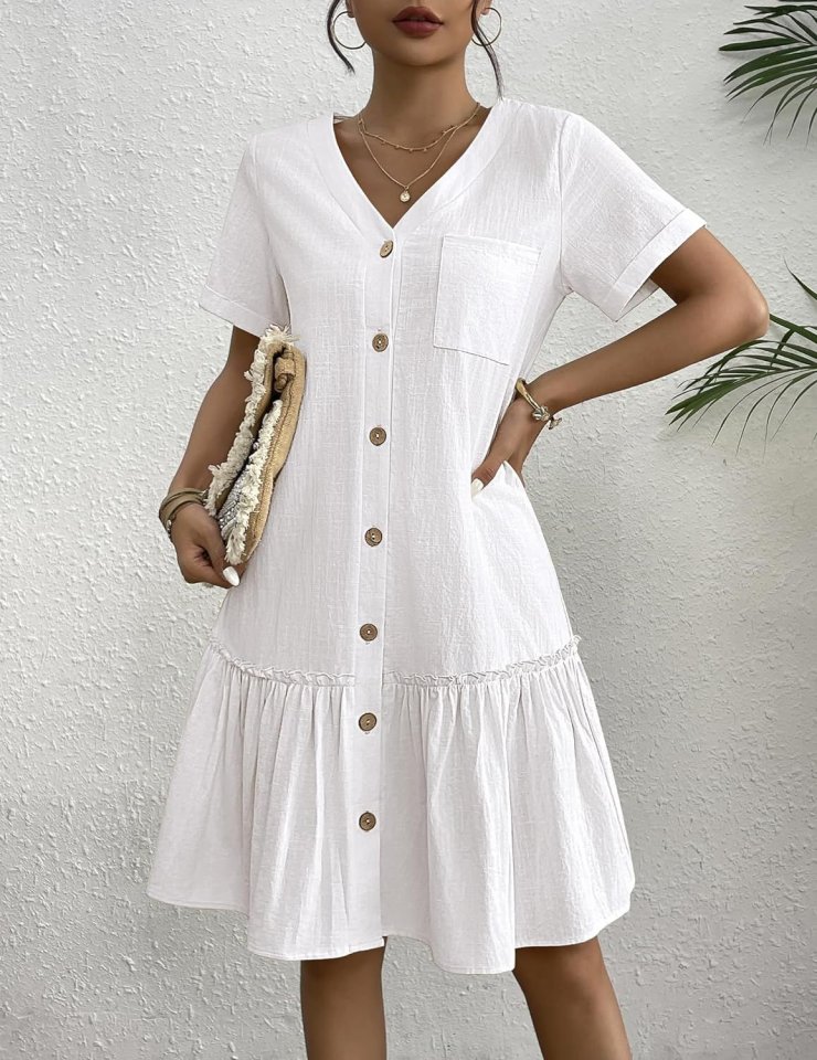 Kadın Cep Detaylı Düğmeli Sofya Keten Kumaş Elbise